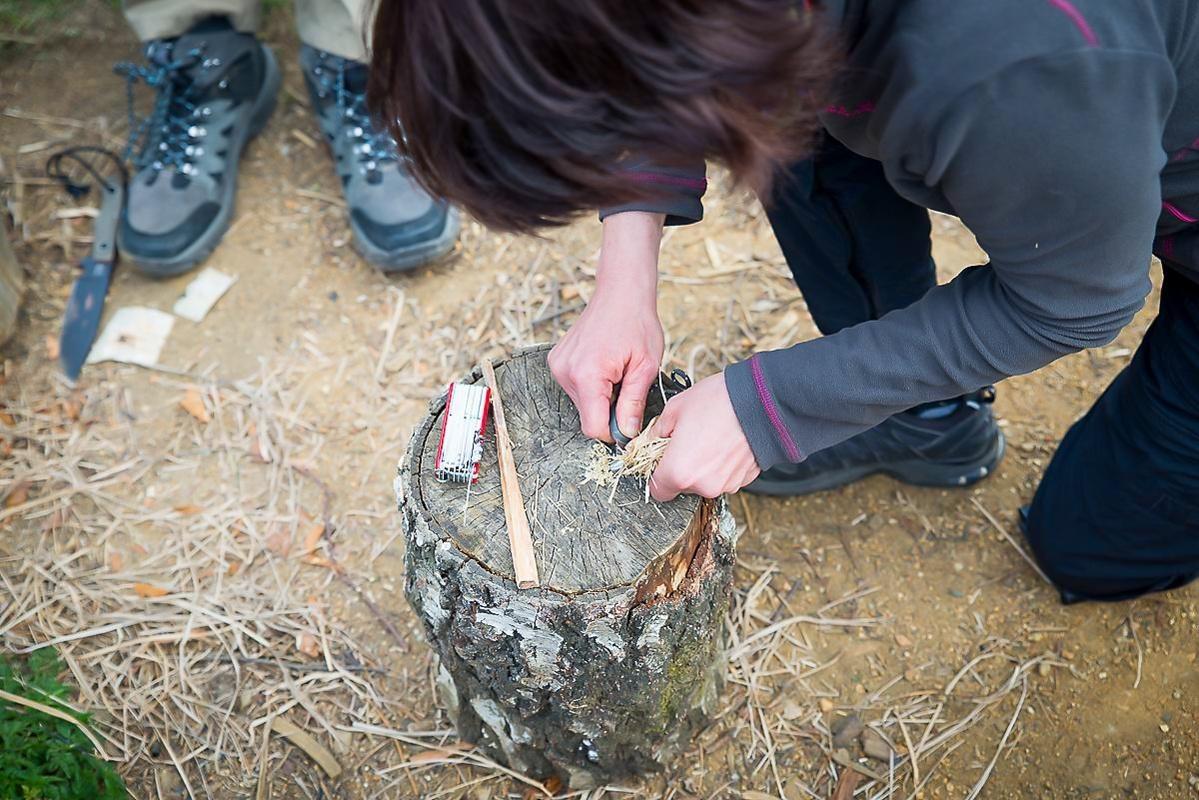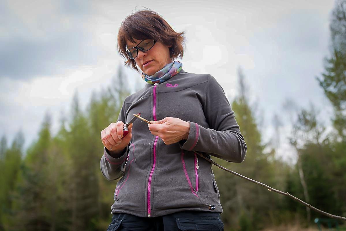 Frau bearbeitet Holzstück mit einem Messer neben einem Lagerfeuer