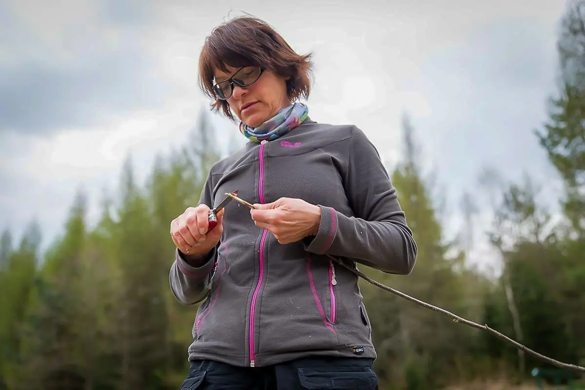 Frau bearbeitet einen Stock mit einem Messer im Freien