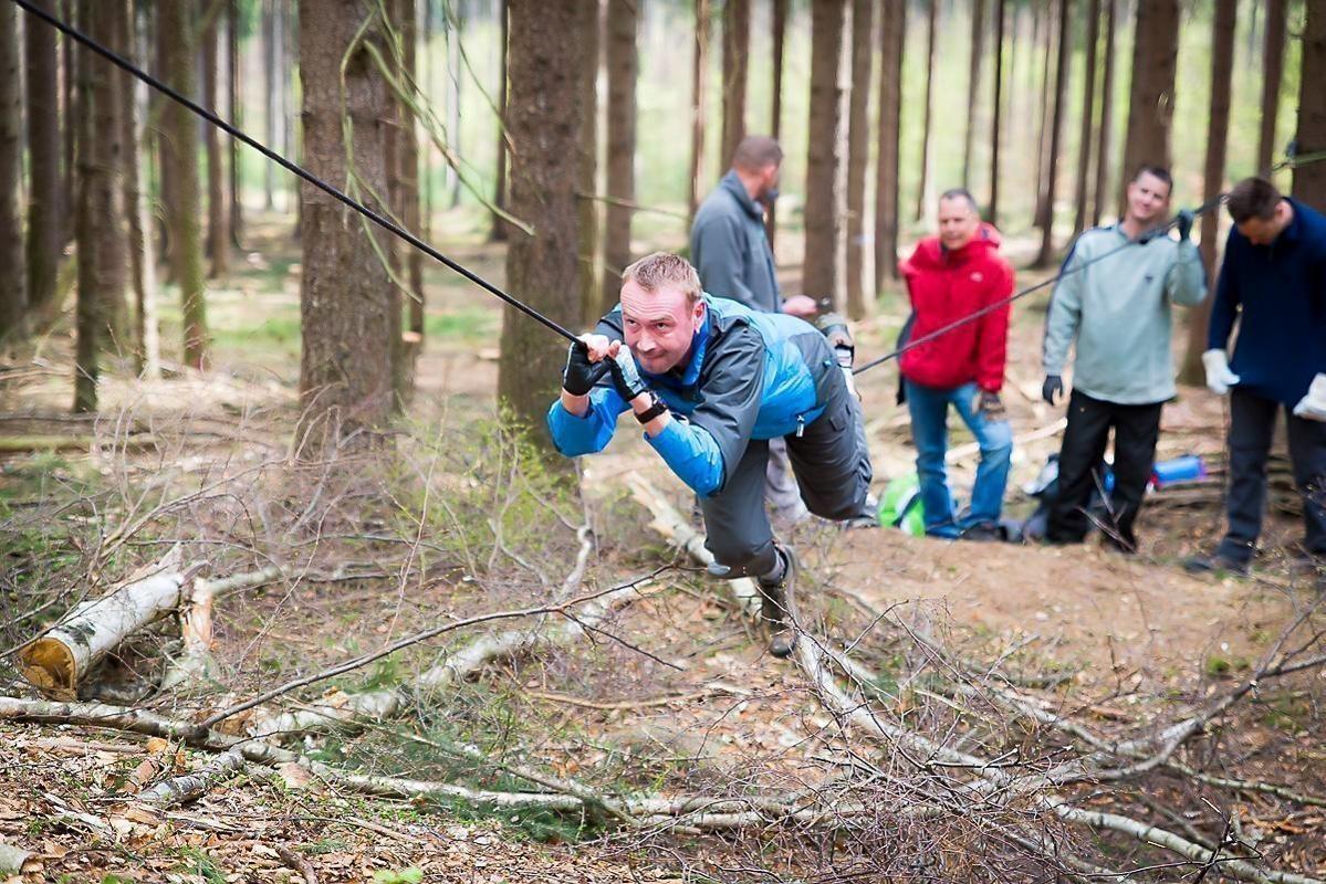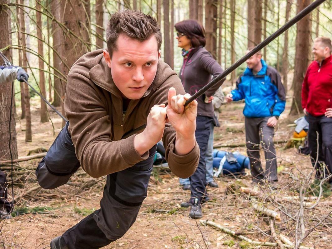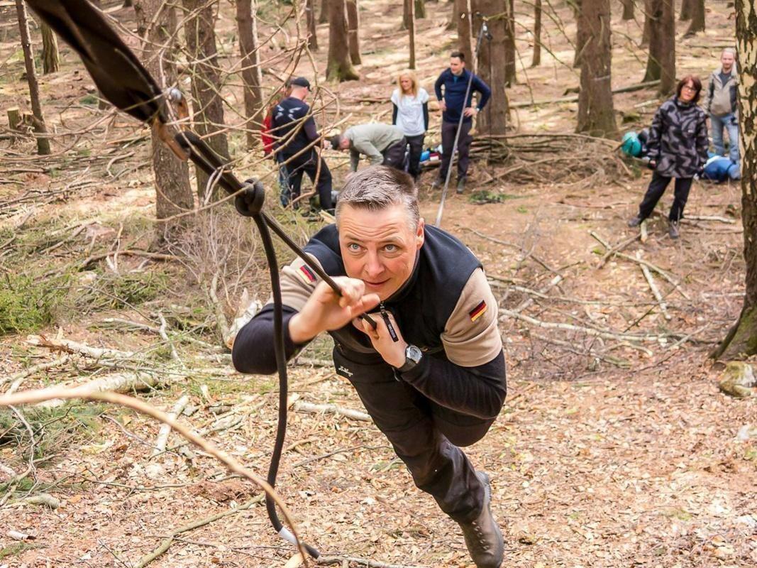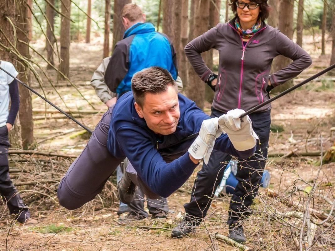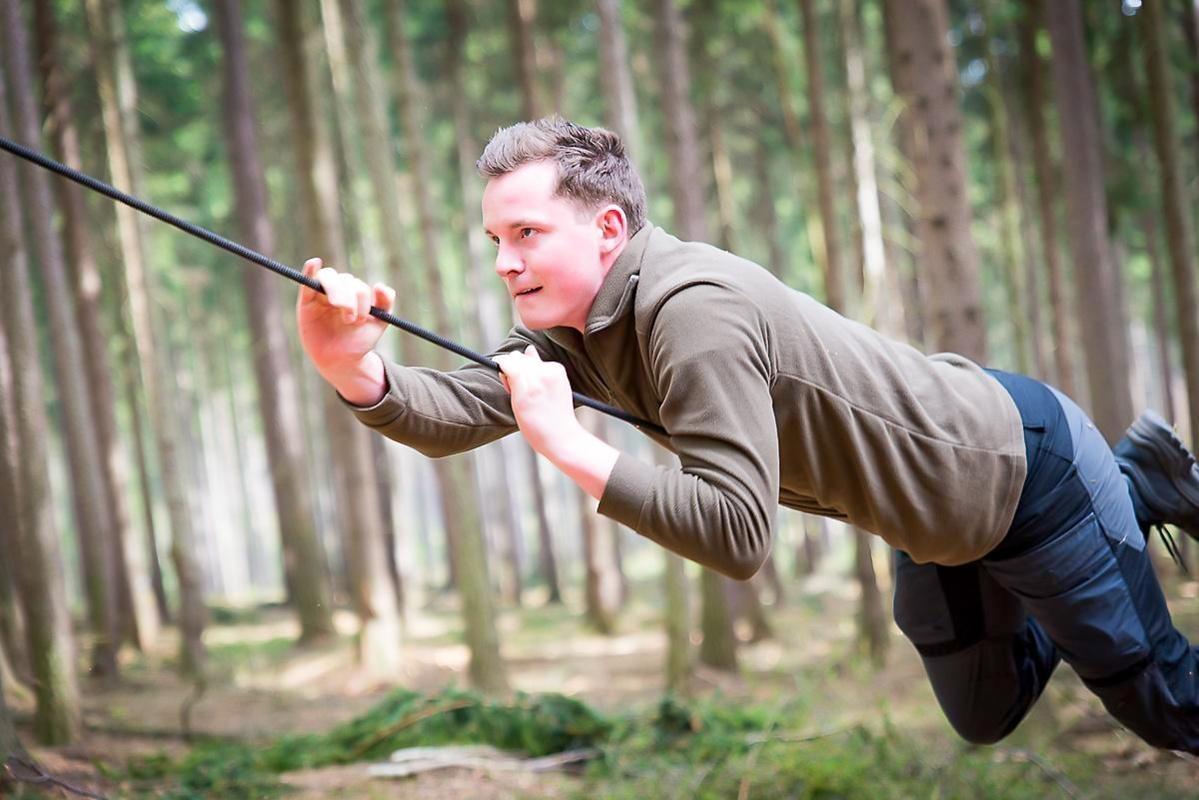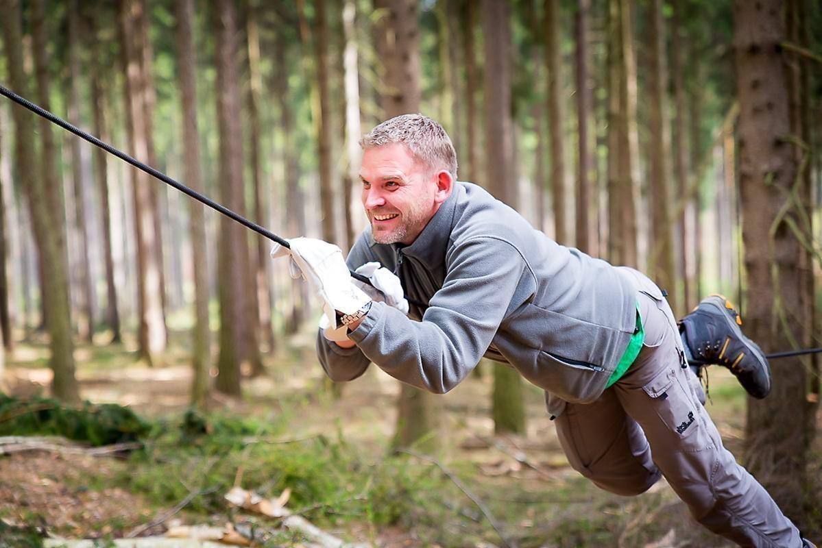 Teilnehmer zieht an einem Seil in einem Waldgebiet