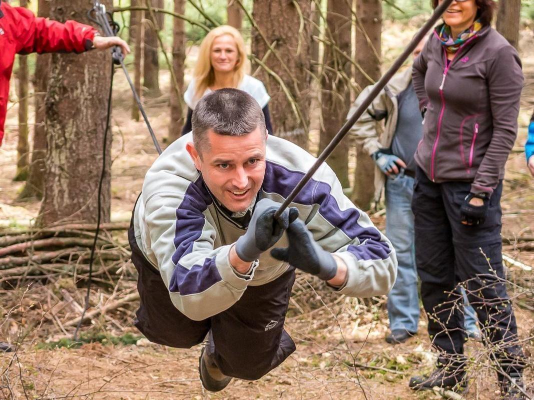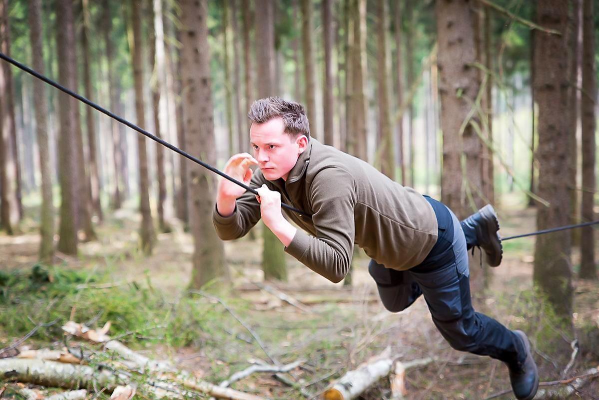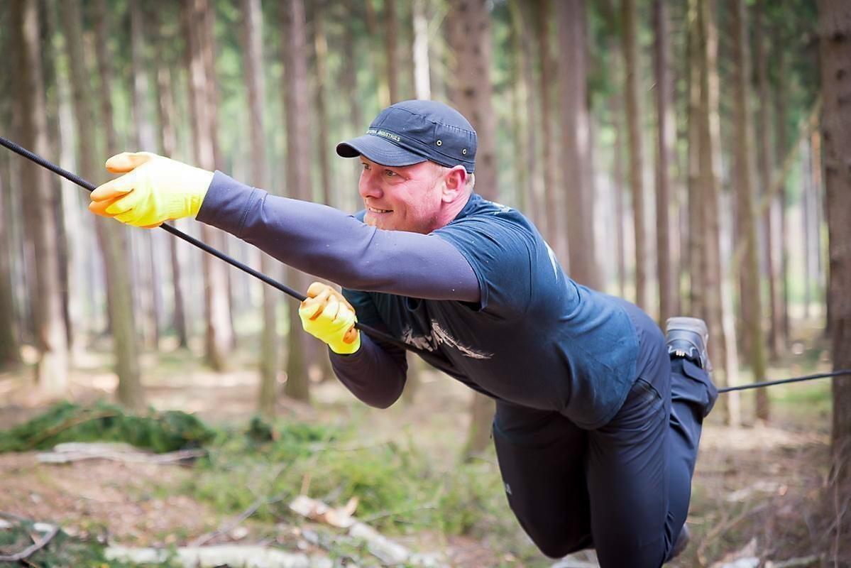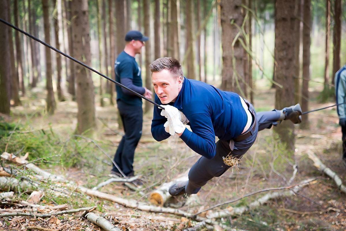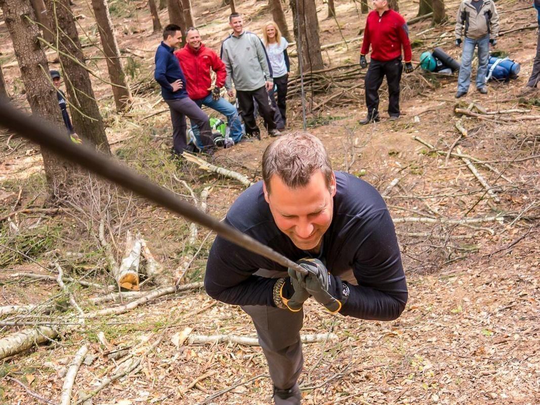 Teilnehmer zieht an einem Seil in einem Waldgebiet