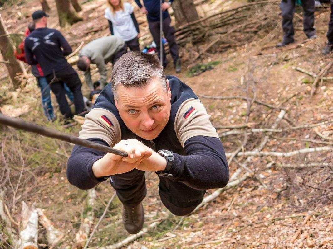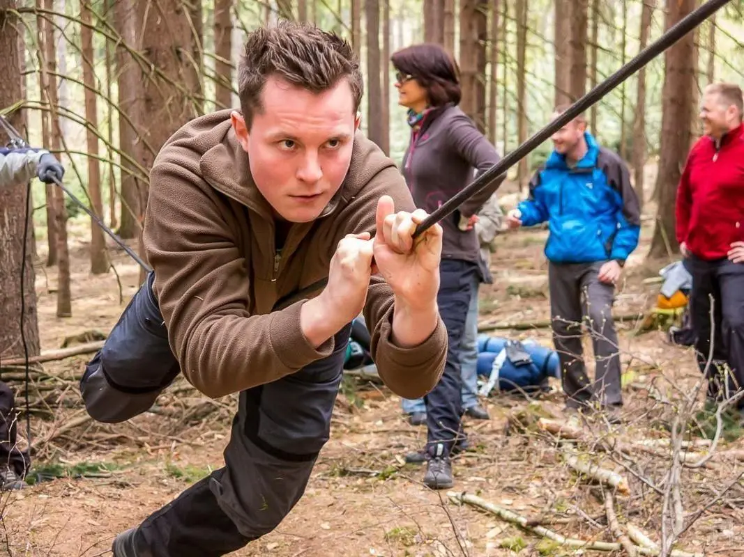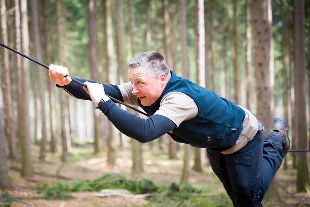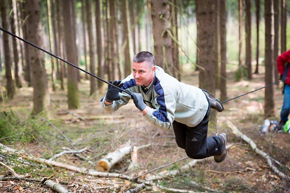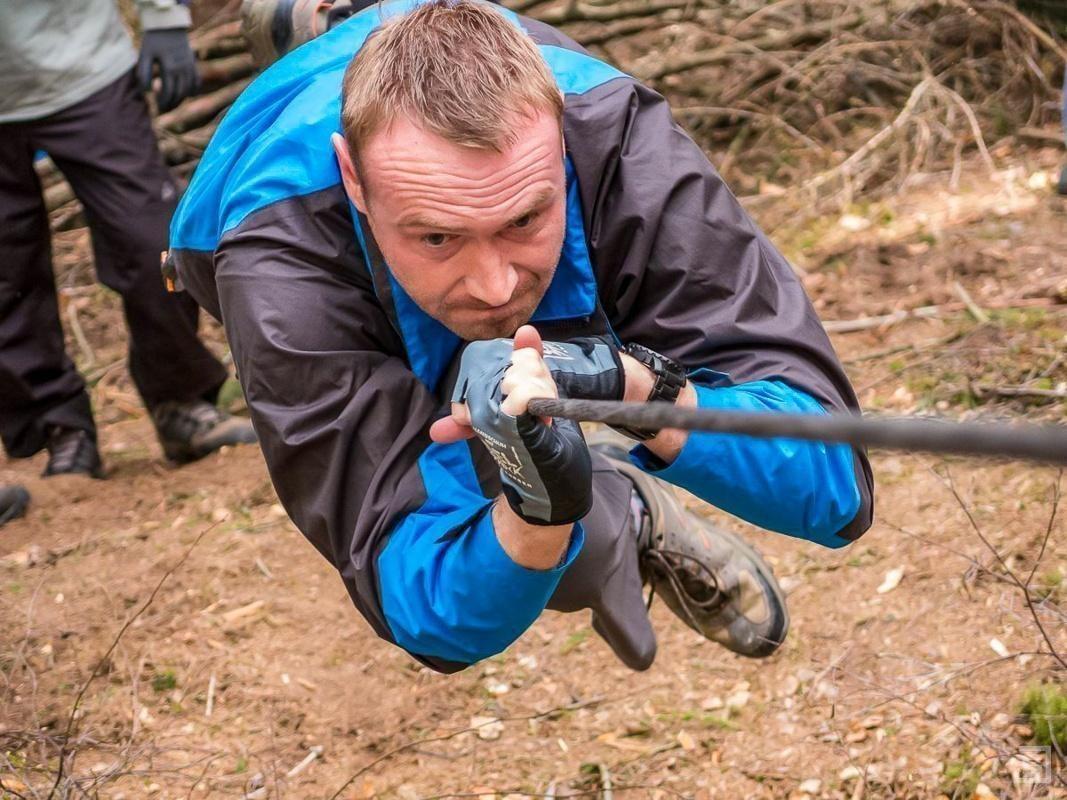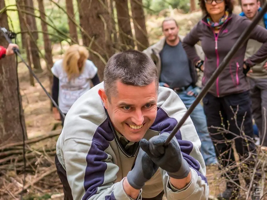 Teilnehmer zieht an einem Seil in einem Waldgebiet