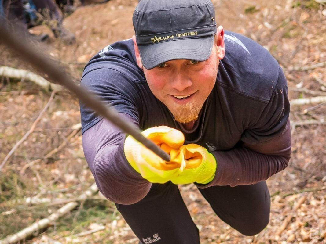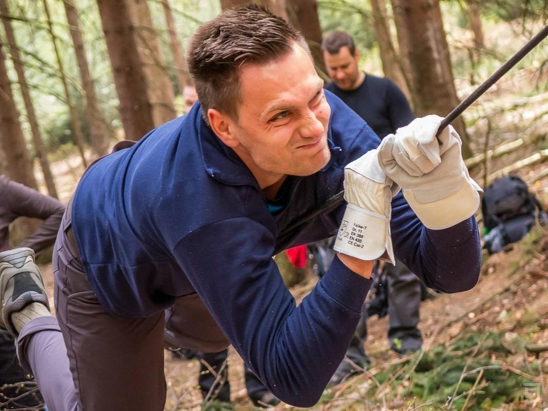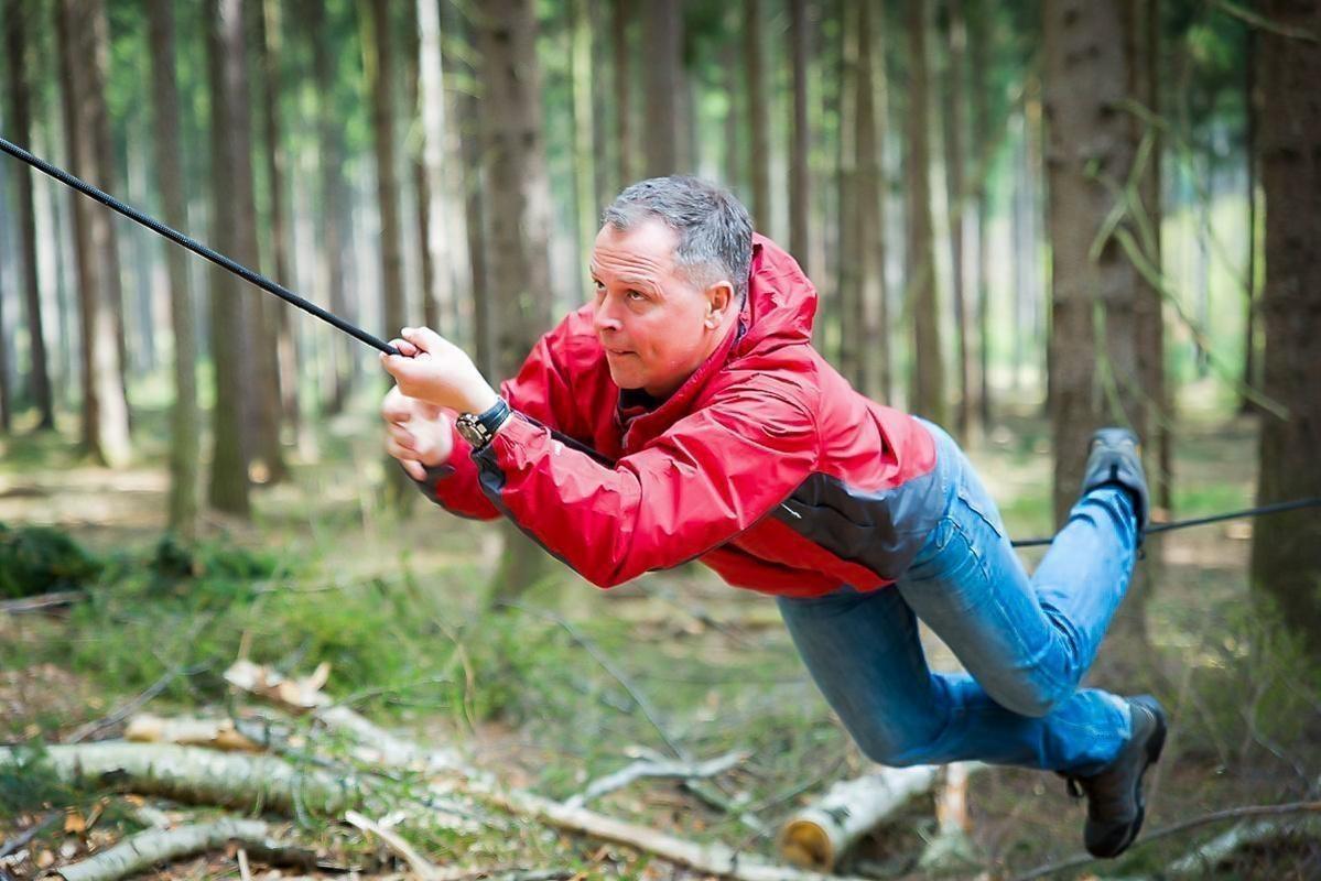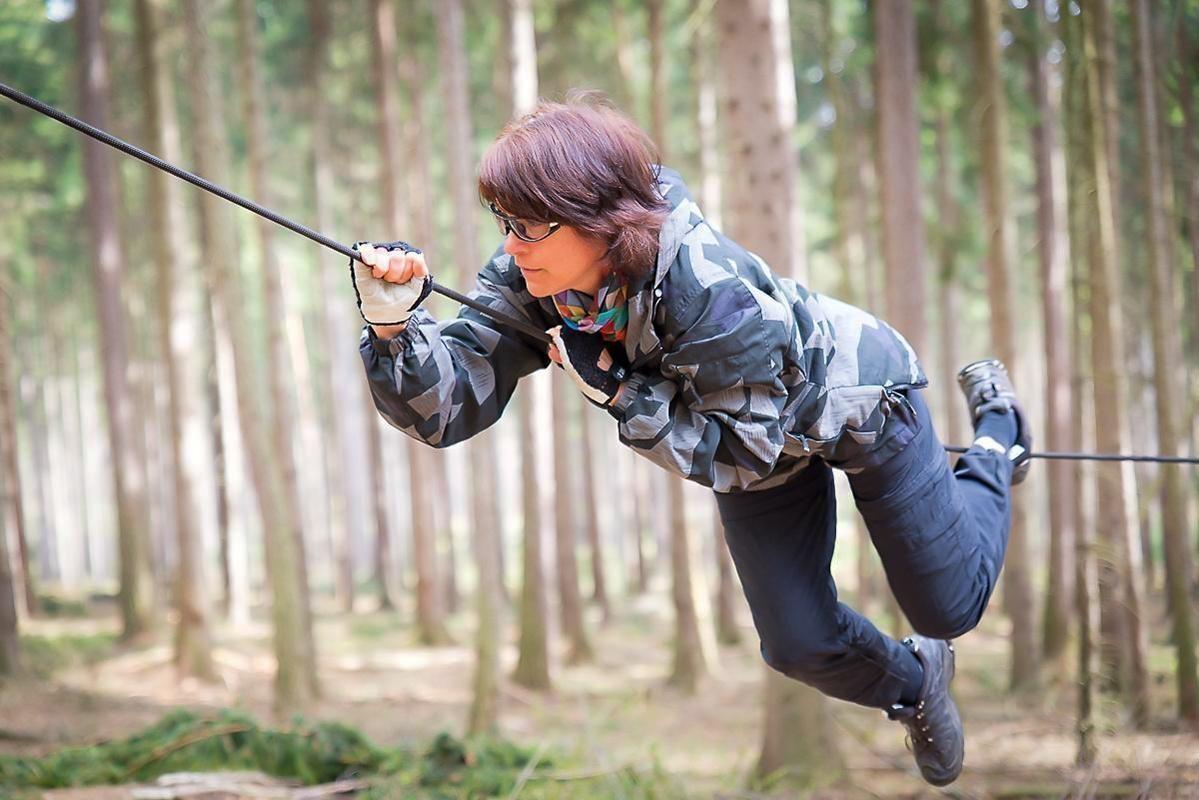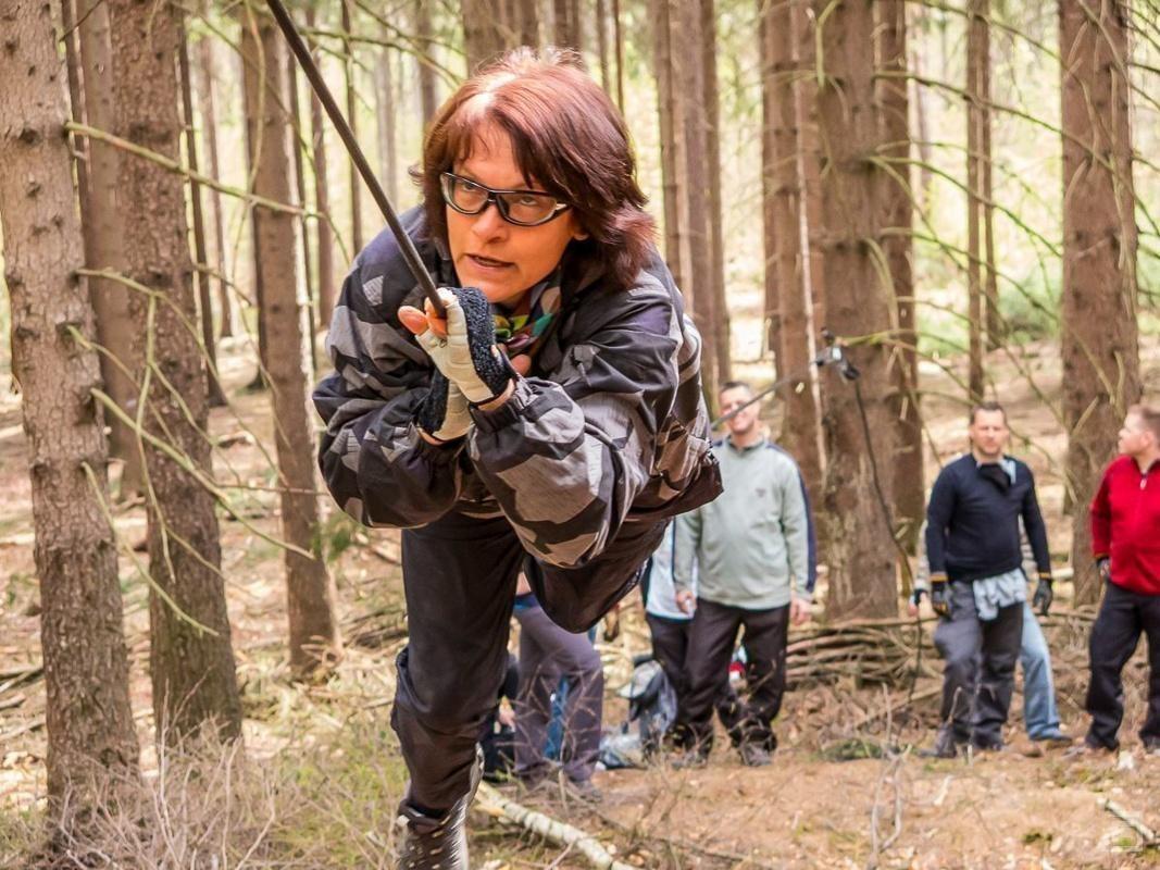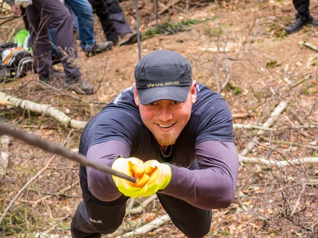 Teilnehmer zieht an einem Seil in einem Waldgebiet