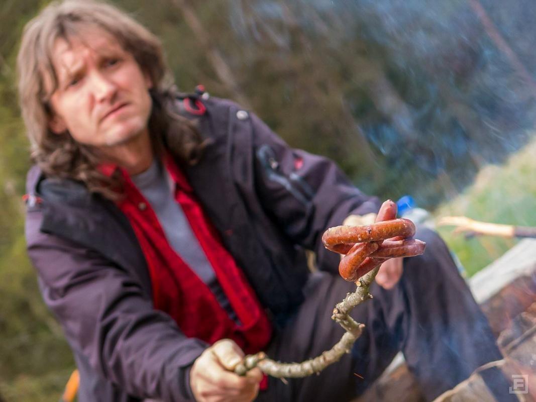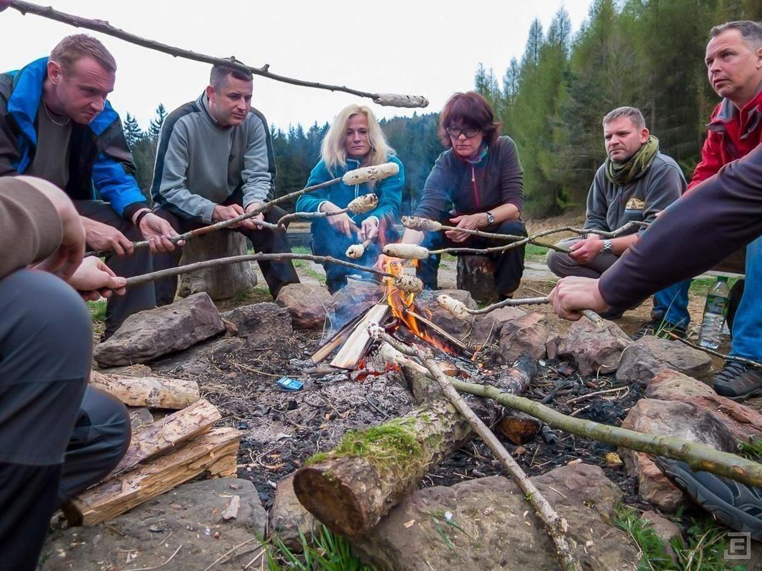 Gruppe sitzt um ein Feuer und röstet Lebensmittel auf langen Stöcken