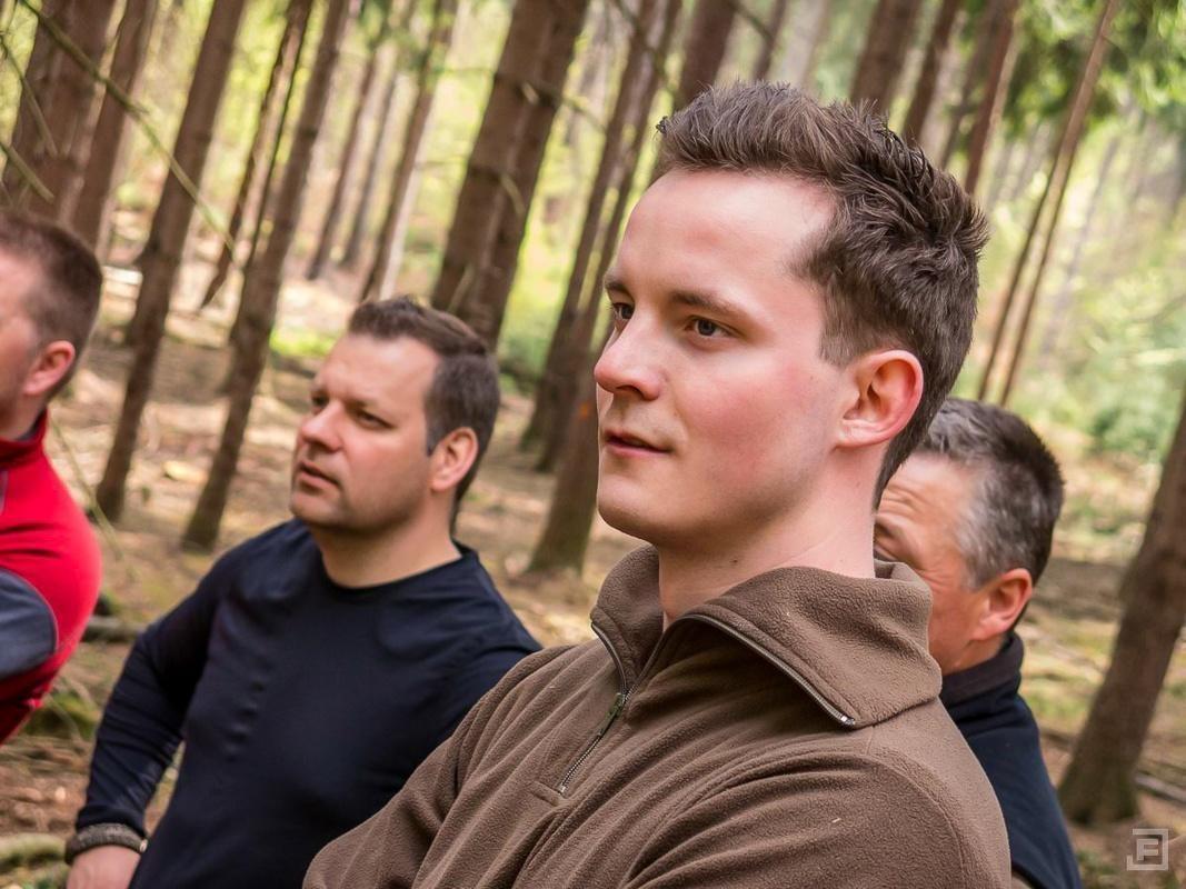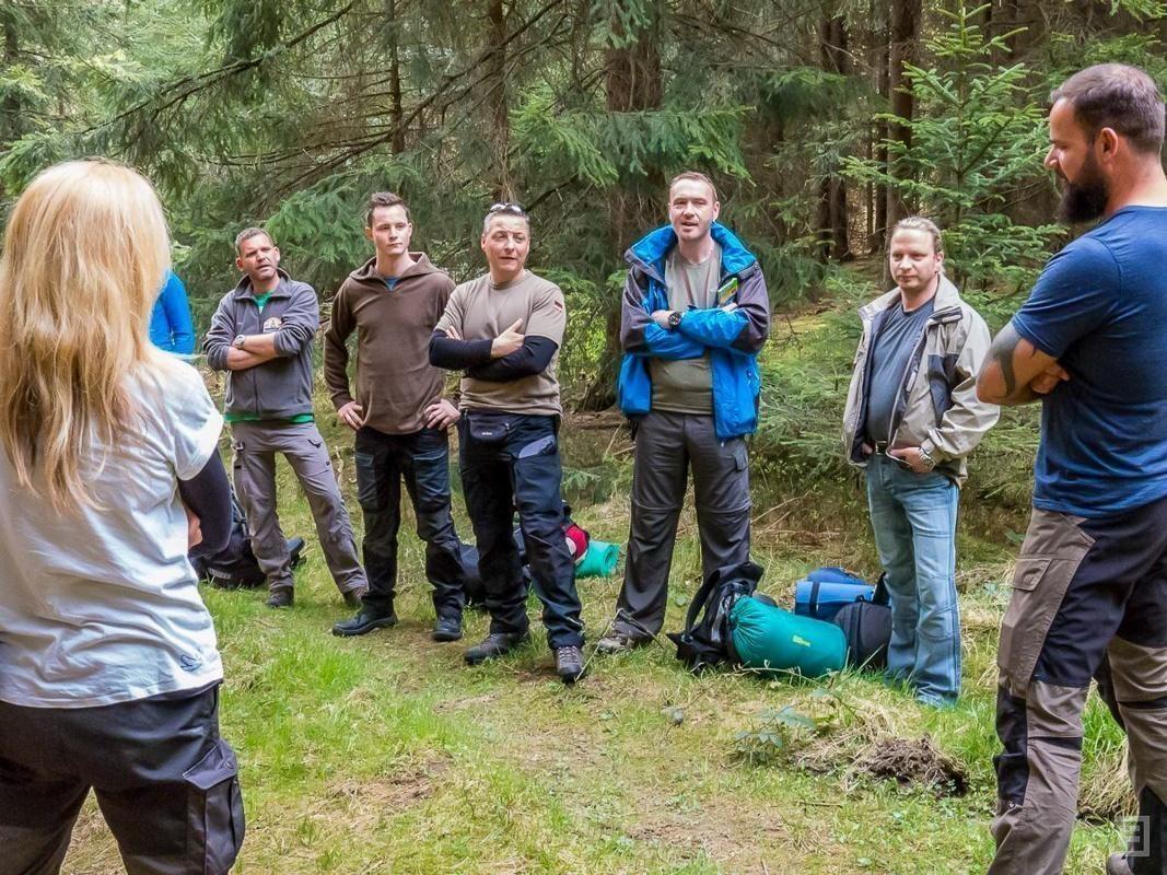 Gruppe von Personen steht im Wald, einige Rucksäcke liegen auf dem Boden