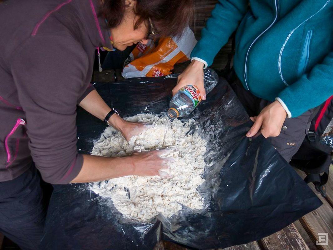 Hände kneten Mehl auf einer schwarzen Folie, während Wasser hinzugefügt wird