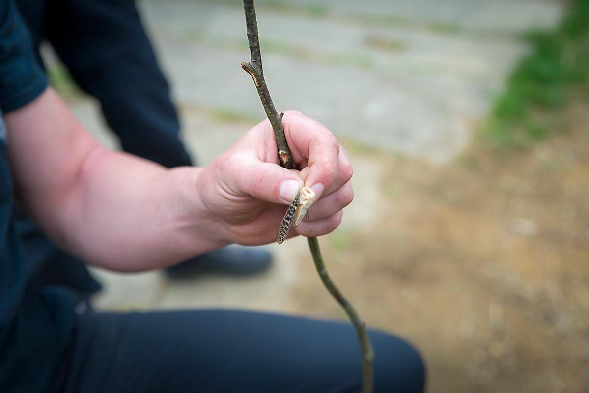 Person hält ein Stück Holz in der Hand und zeigt es einem anderen