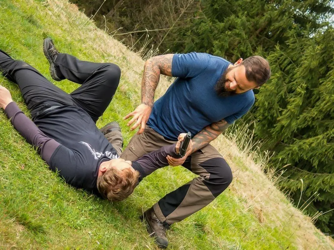 Zwei Personen stehen im Wald, eine hält eine Pistole, die andere greift unterstützend zu