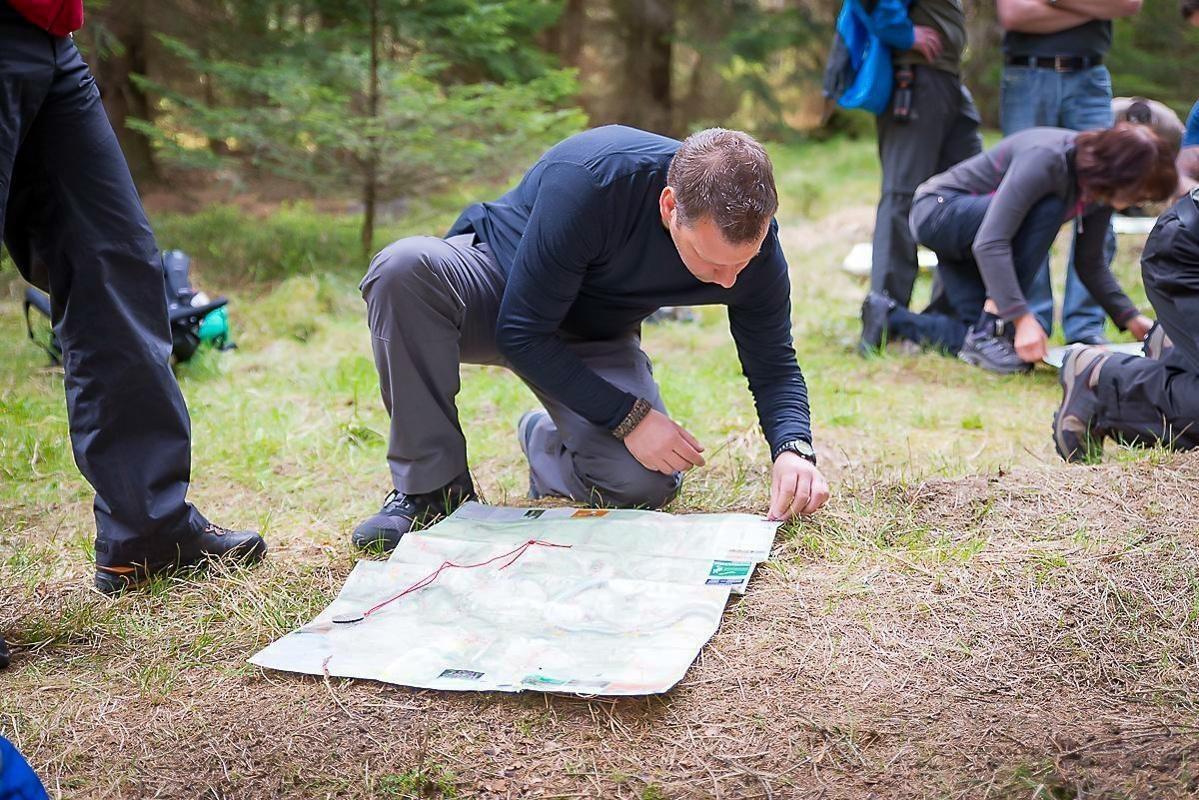Gruppenteilnehmer knien auf dem Boden und studieren Karten im Wald