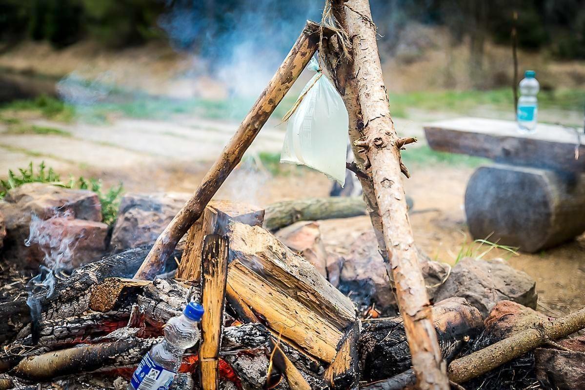 Wasserflasche steht neben glühenden Holzresten eines kleinen Bodenfeuers
