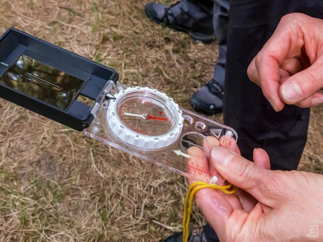 Kompass wird in der Hand gehalten, Zeiger zeigt auf Norden
