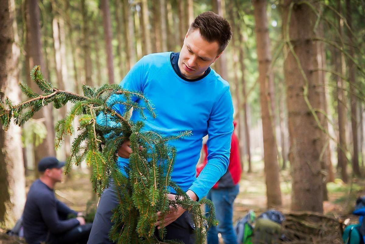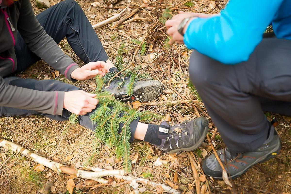 Zwei Personen binden Äste und Tannenzweige zu einer improvisierten Trage