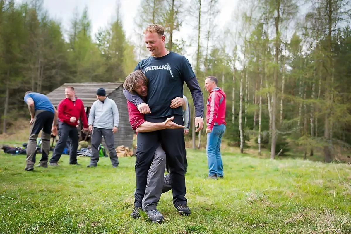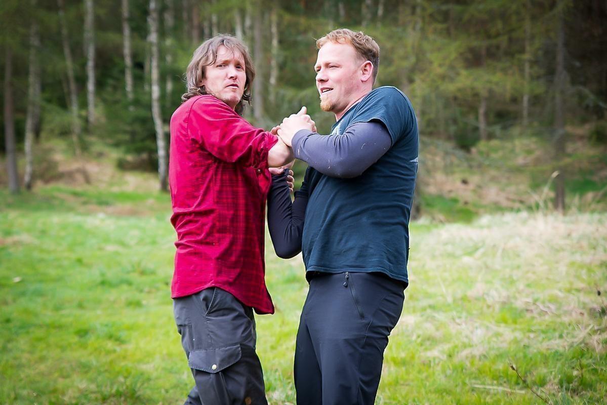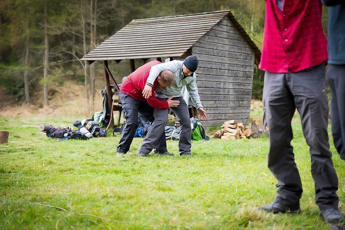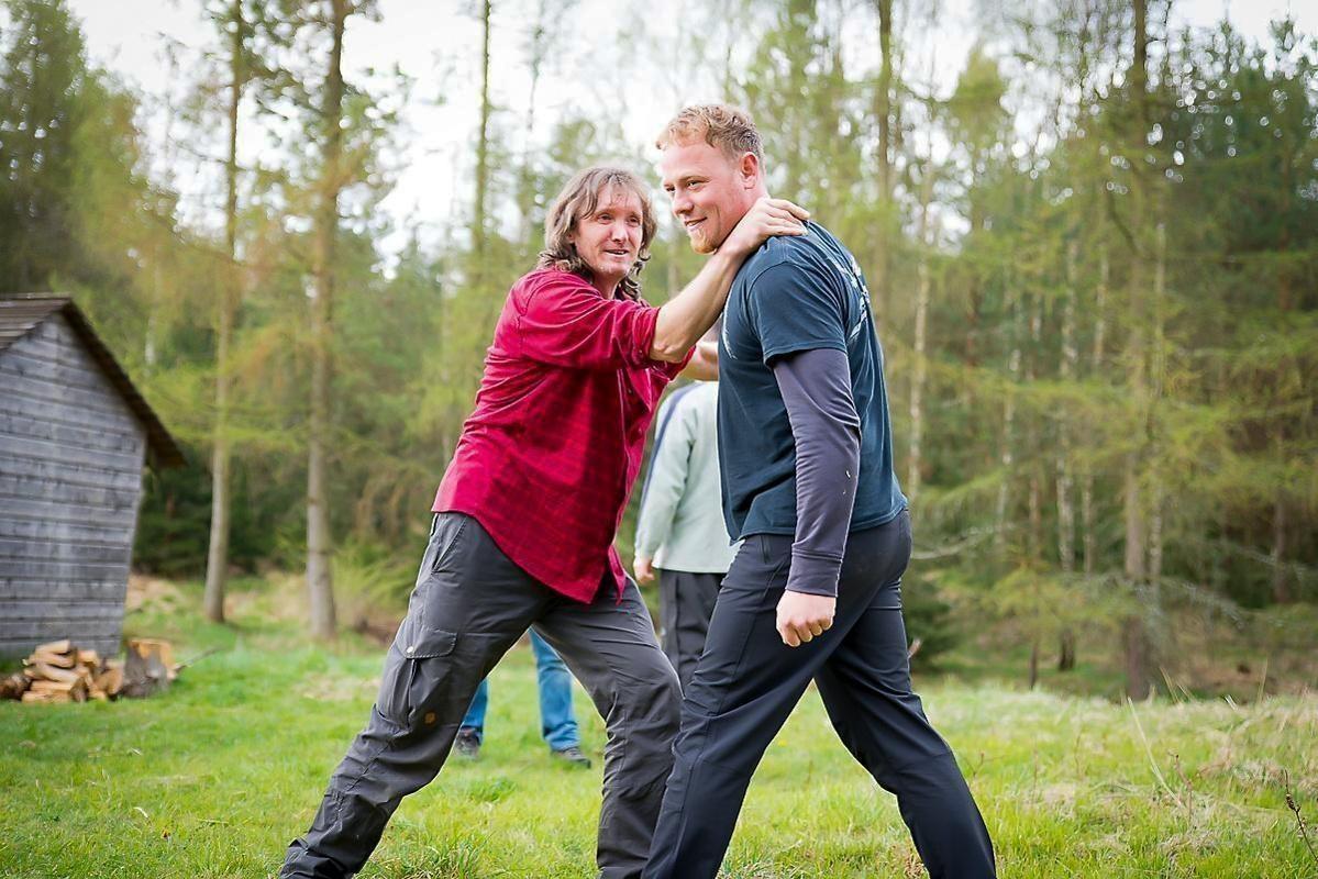 Zwei Personen üben eine körperliche Technik im Freien, umgeben von Bäumen und einer Holzhütte