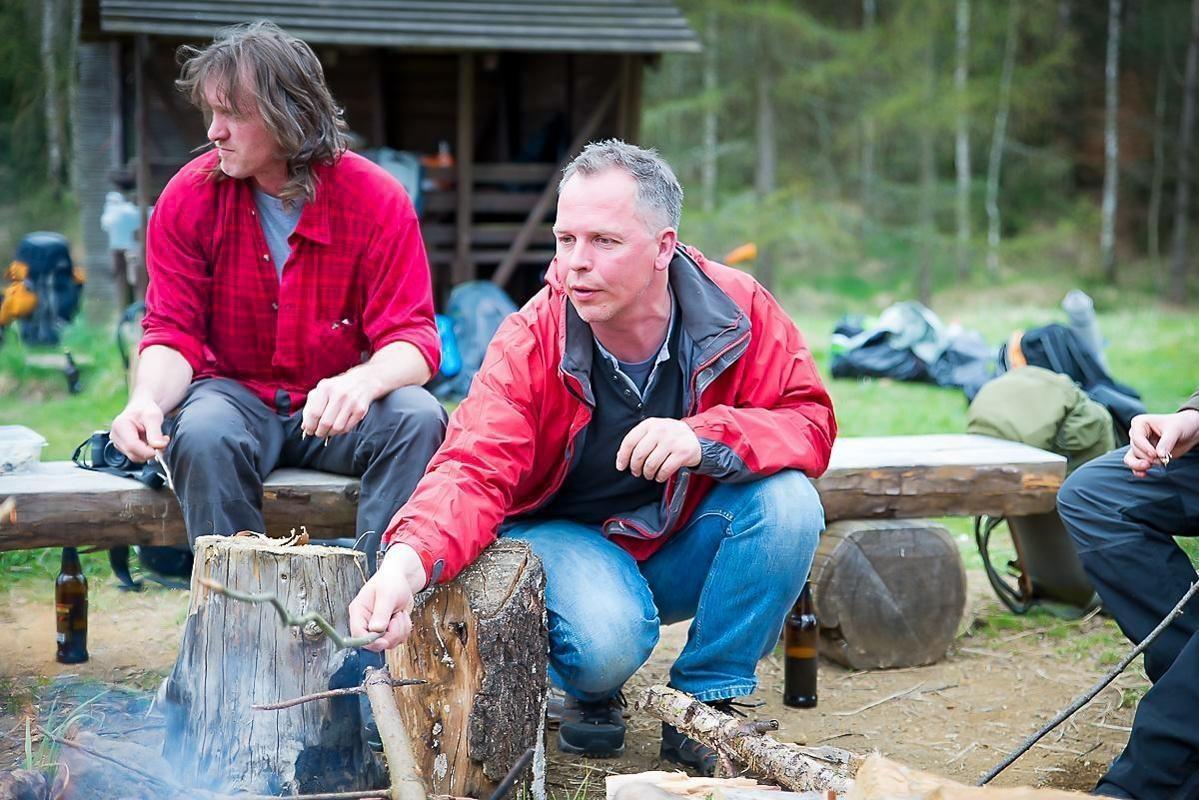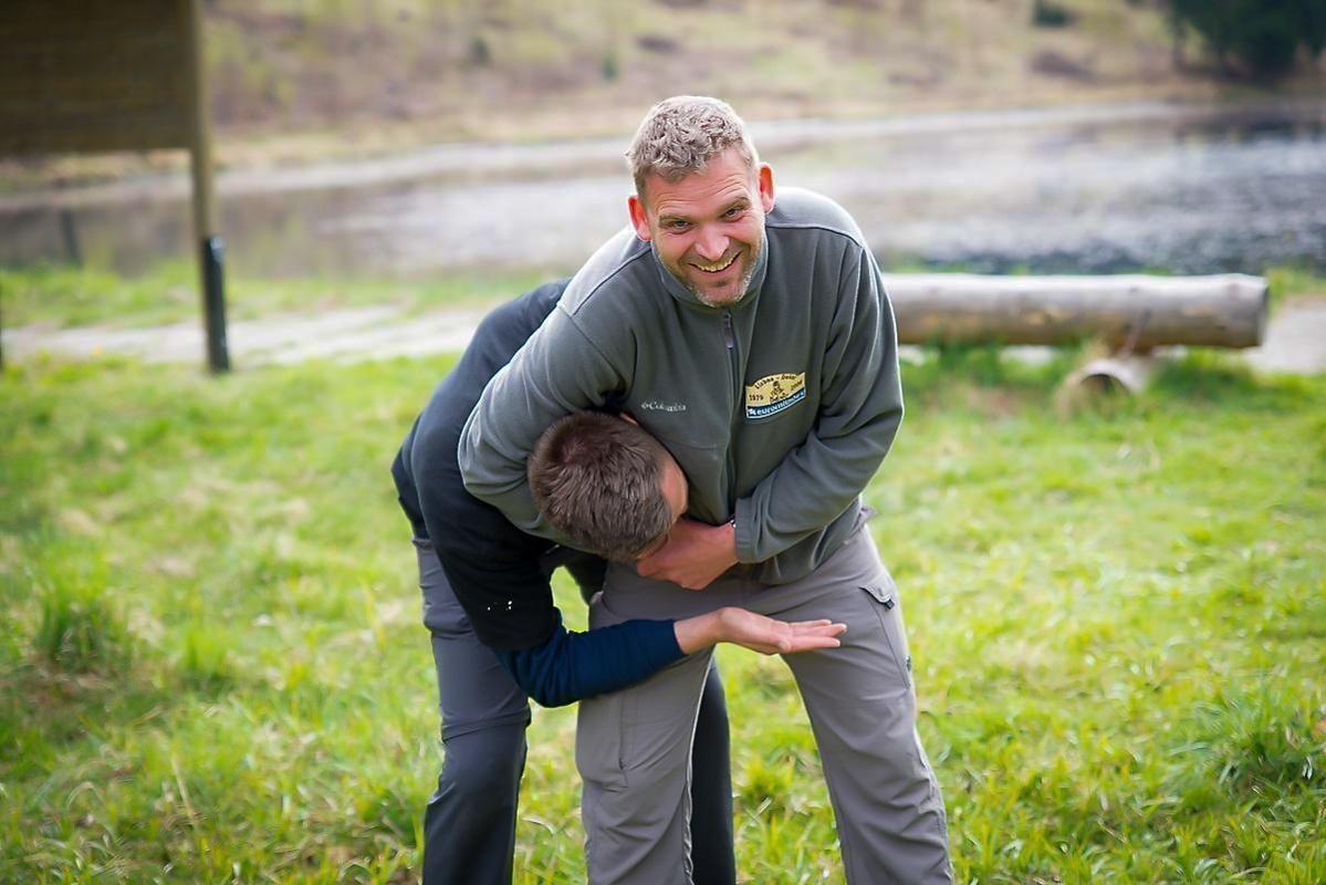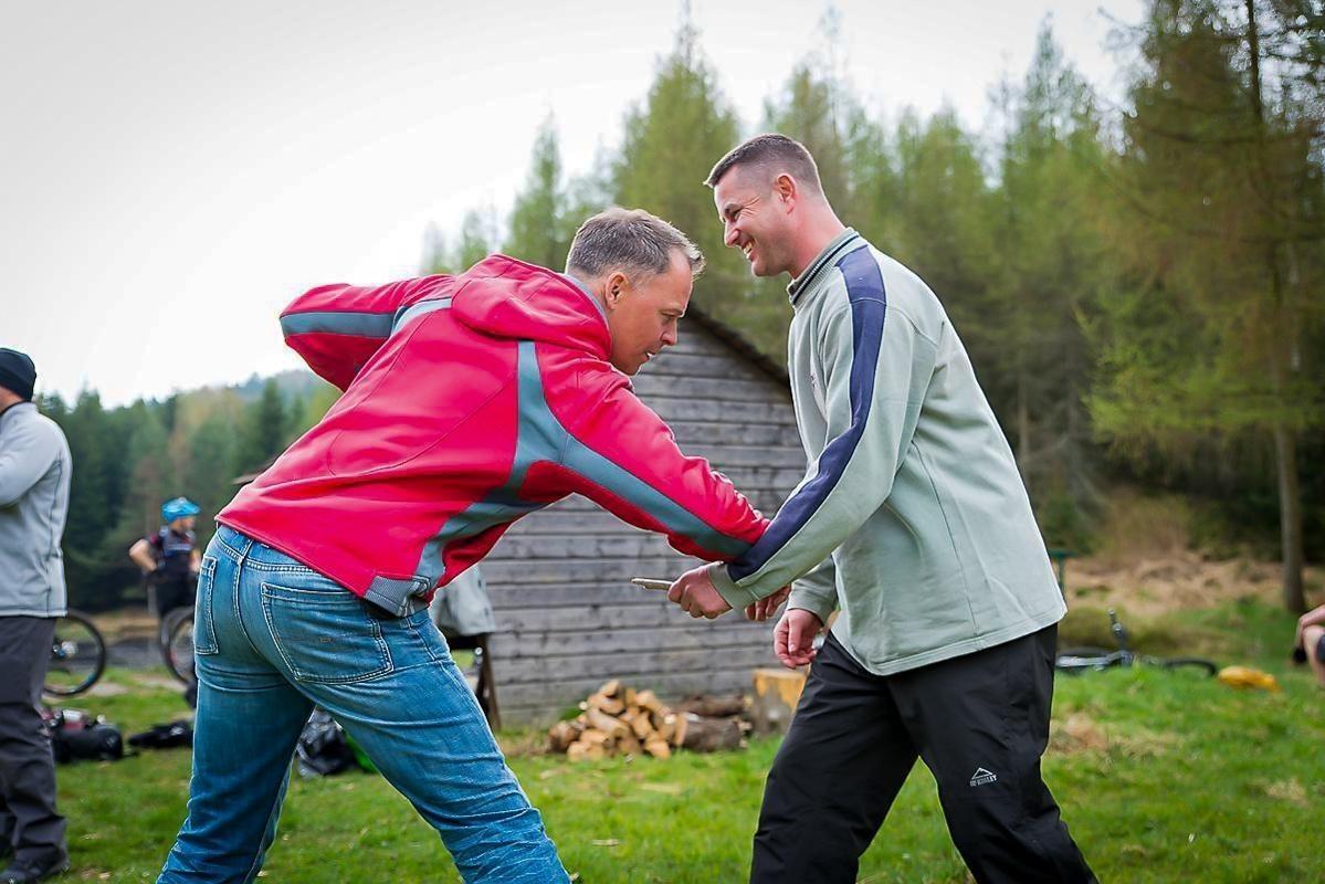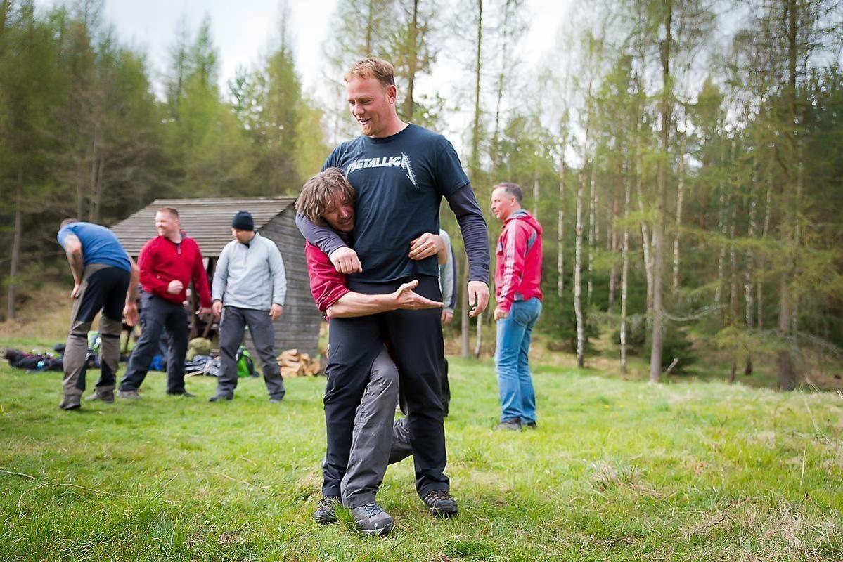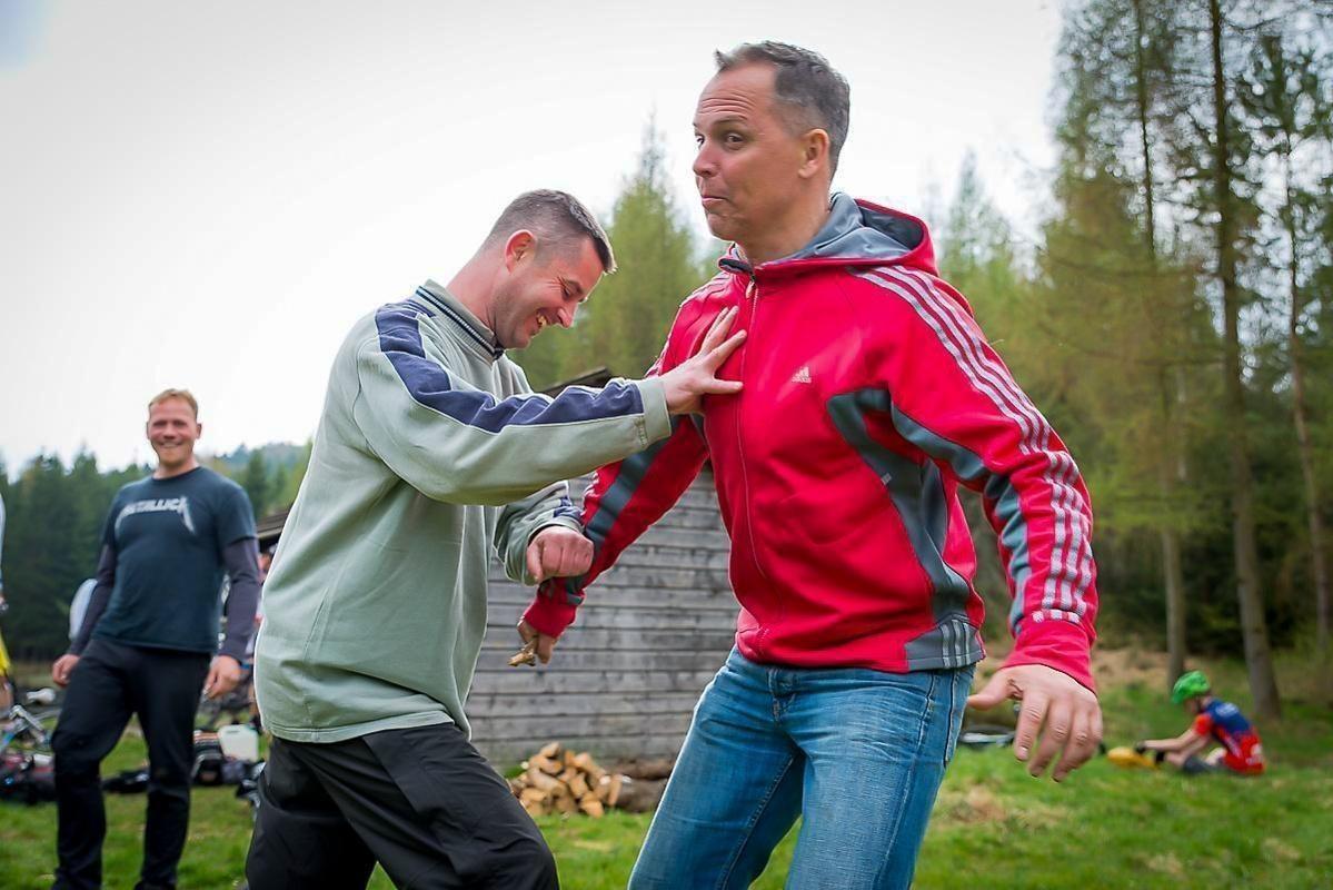 Zwei Personen üben eine körperliche Technik im Freien, umgeben von Bäumen und einer Holzhütte