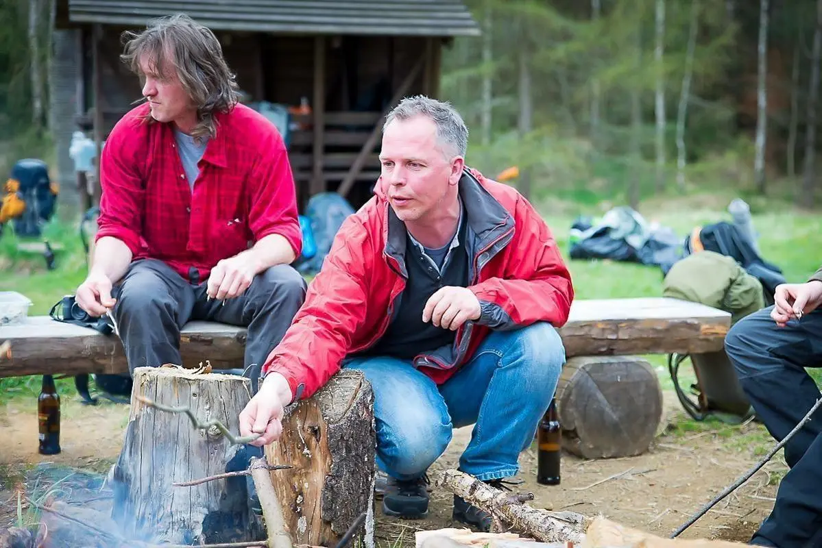 Zwei Personen sitzen am Lagerfeuer und bereiten Essen in einem Topf zu