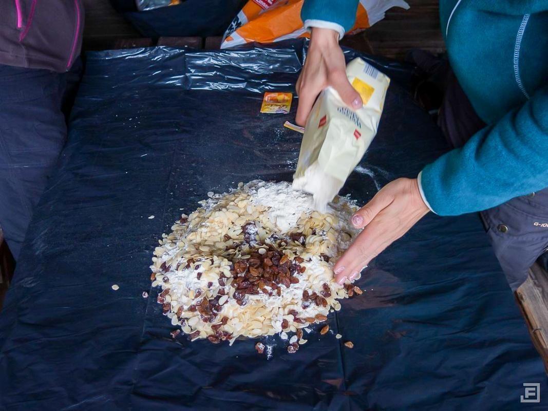 Zwei Personen bereiten Lebensmittel auf einem Tisch in einer Hütte vor