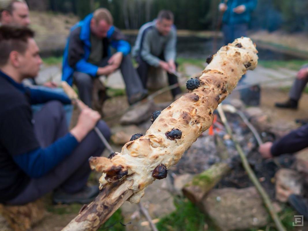 Teigstücke rösten über einem kleinen Feuer auf Stockspießen