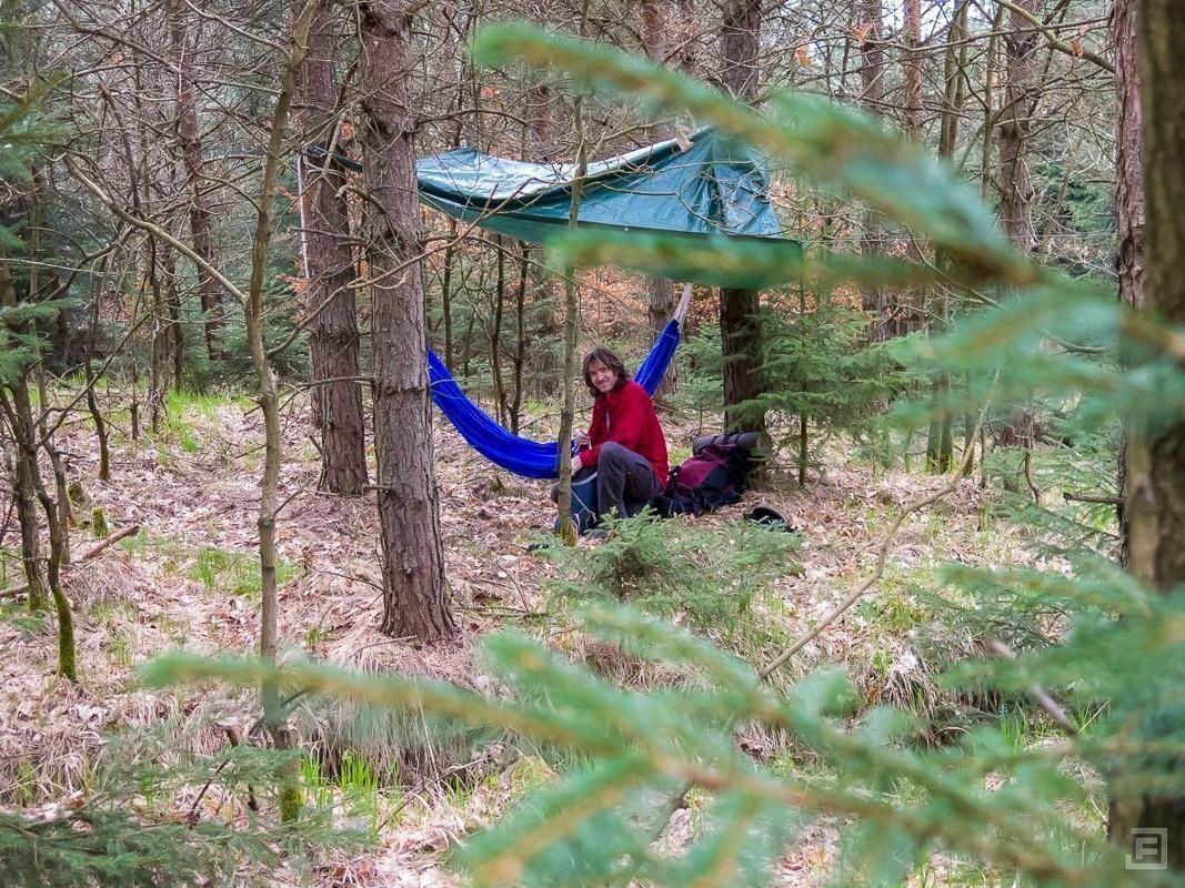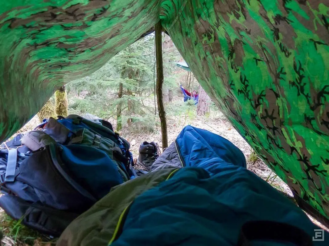 Tarp-Notunterkunft hängt zwischen Bäumen, darunter sitzt eine Person in einer Hängematte