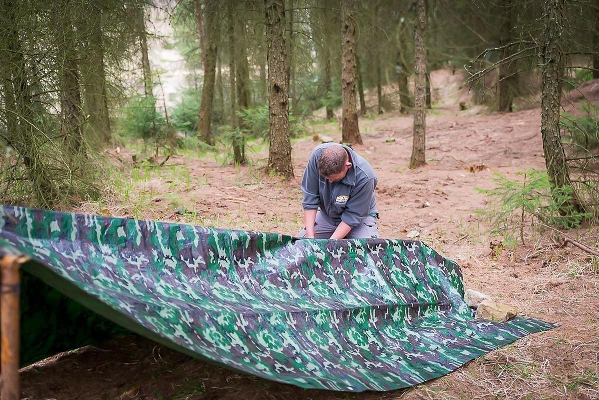 Tarp-Notunterkunft aus Tarnmaterial zwischen Bäumen, Person packt Rucksack
