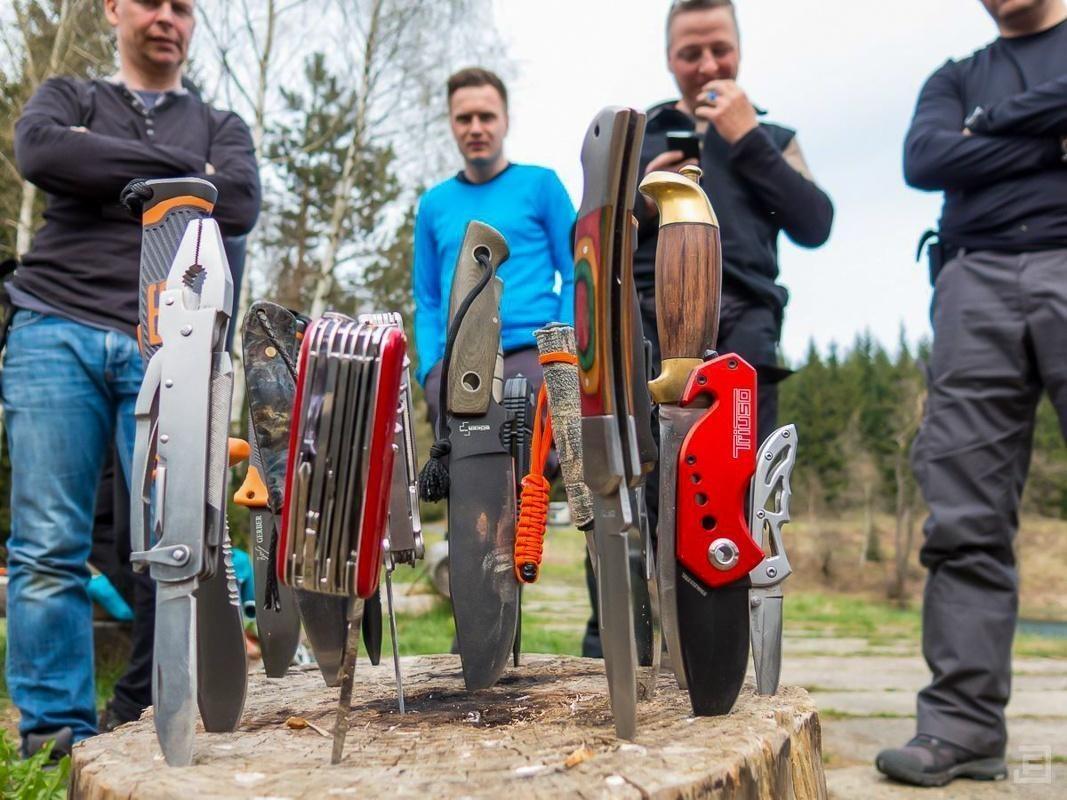 Verschiedene Messer stehen auf einem Baumstumpf, während Personen im Hintergrund stehen