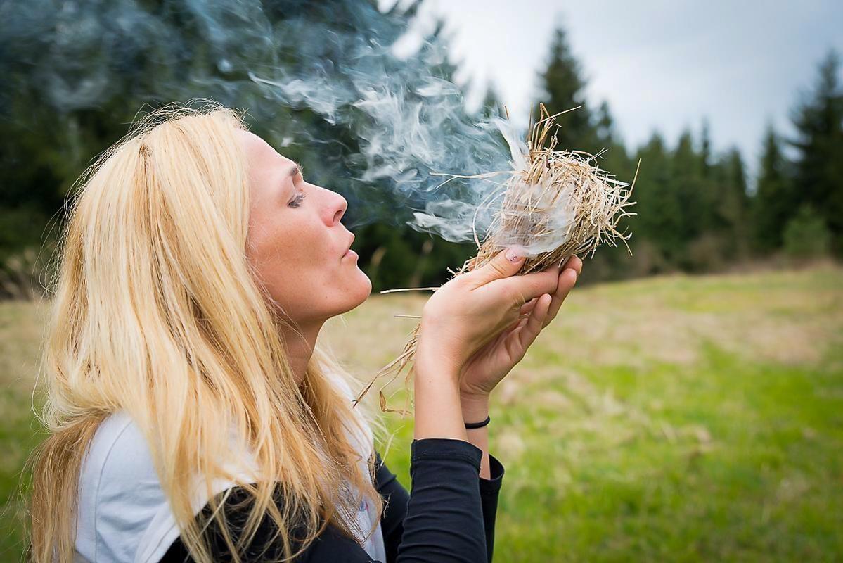 Zunder glimmt in Händen, während Luftzufuhr für Flamme sorgt