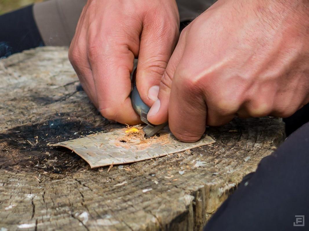 Feuerstahl erzeugt Funken auf Holzstück während Messer sichtbar ist
