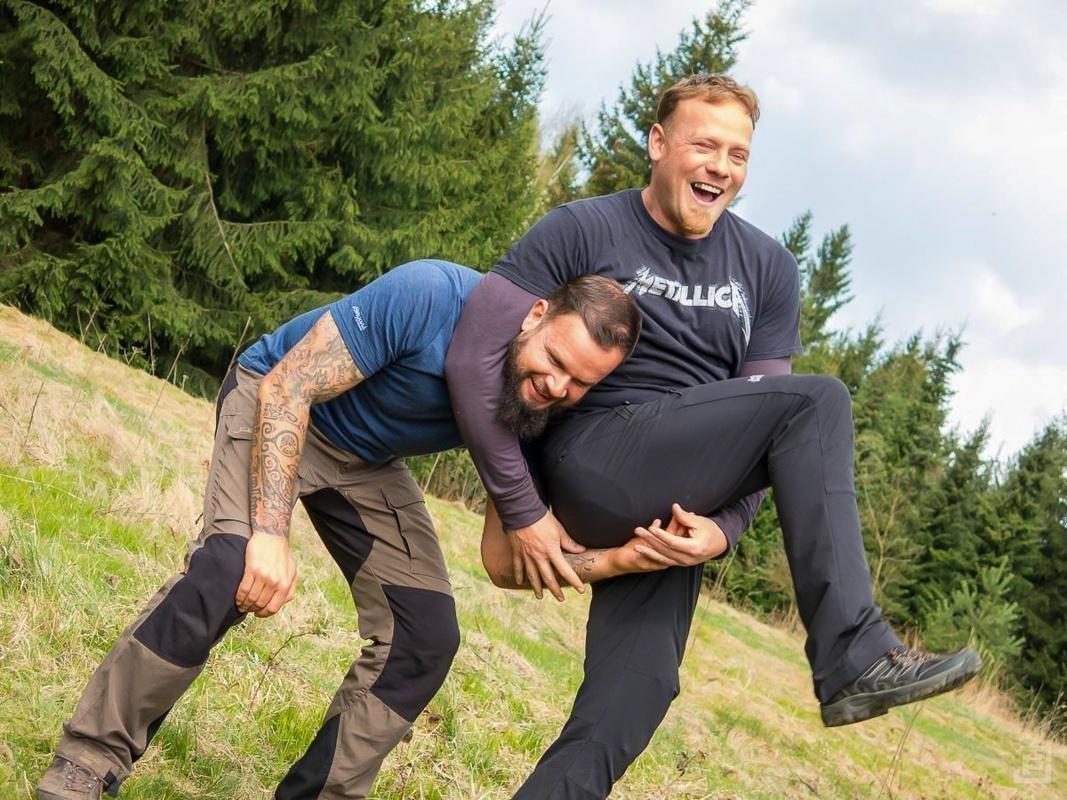 Zwei Männer heben einen anderen Mann an, während sie auf einer Wiese stehen