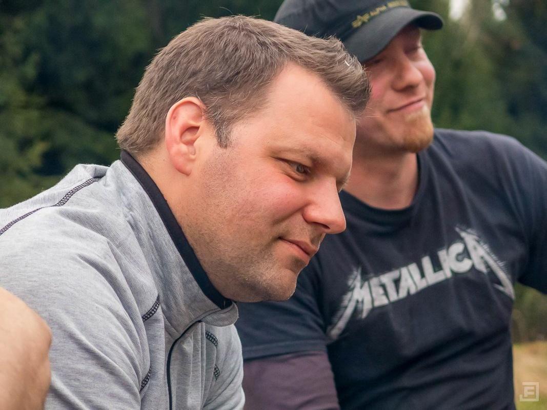 Zwei Männer stehen in einer natürlichen Umgebung und unterhalten sich