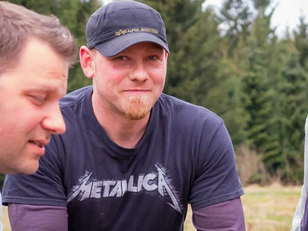 Eine Person in einer grünen Jacke steht mit verschränkten Armen vor einem Wald