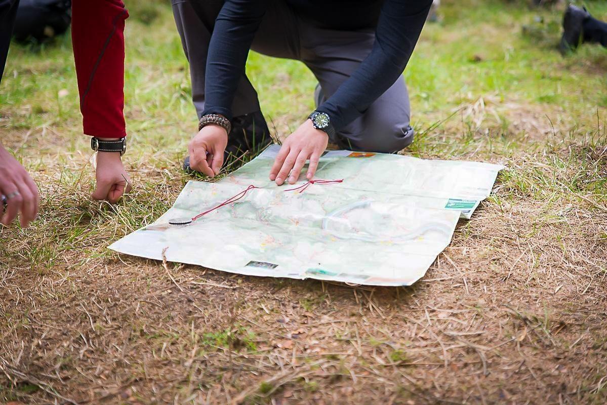 Zwei Personen studieren eine Karte auf dem Boden im Wald