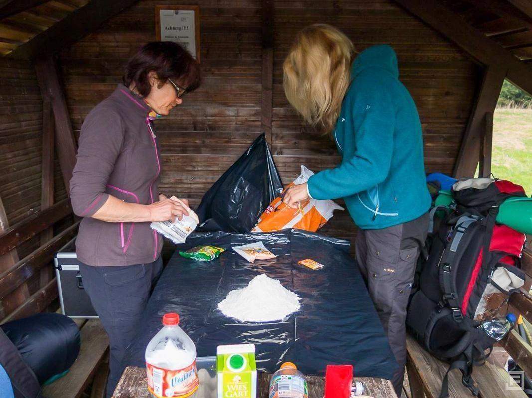 Zwei Personen bereiten Lebensmittel auf einem Tisch in einer Unterstandshütte vor