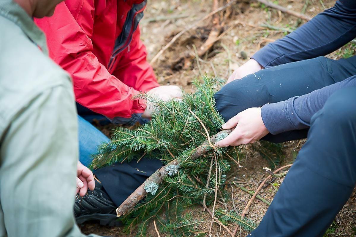 Gruppe arbeitet an einer selbstgebauten Konstruktion aus Ästen im Wald