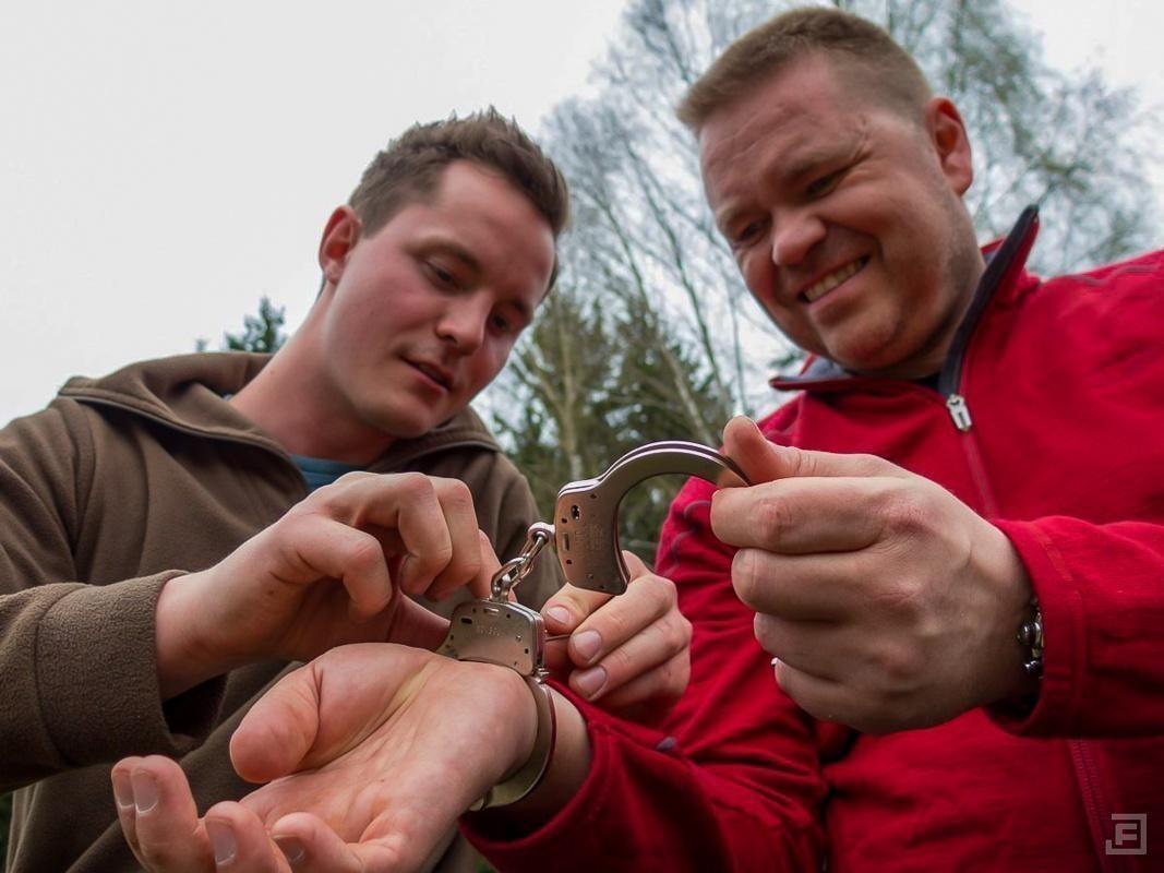 Zwei Personen üben den Umgang mit Handschellen im Freien