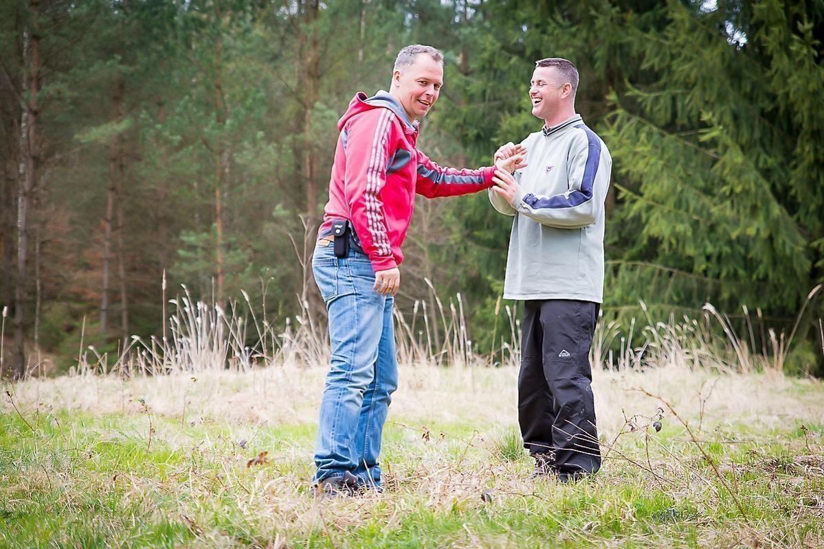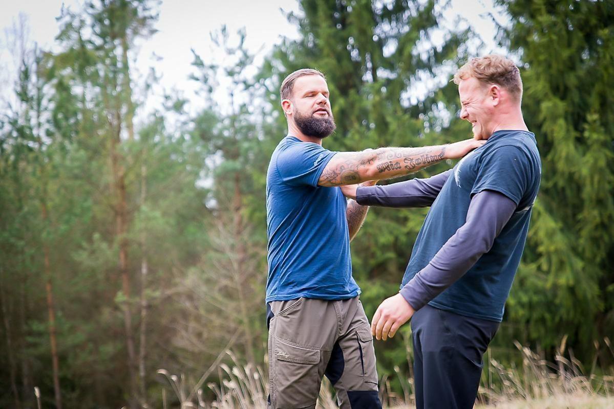 Zwei Personen üben eine körperliche Technik in einer Waldumgebung