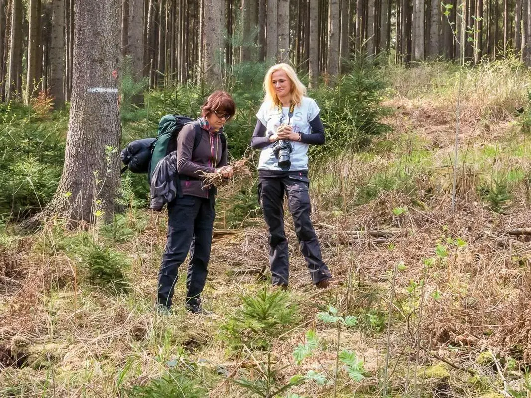 Zwei Personen stehen im Wald und betrachten Pflanzenmaterial