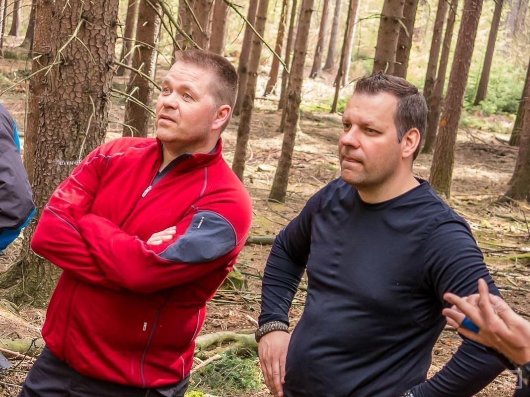 Zwei Personen stehen im Wald und beobachten die Umgebung