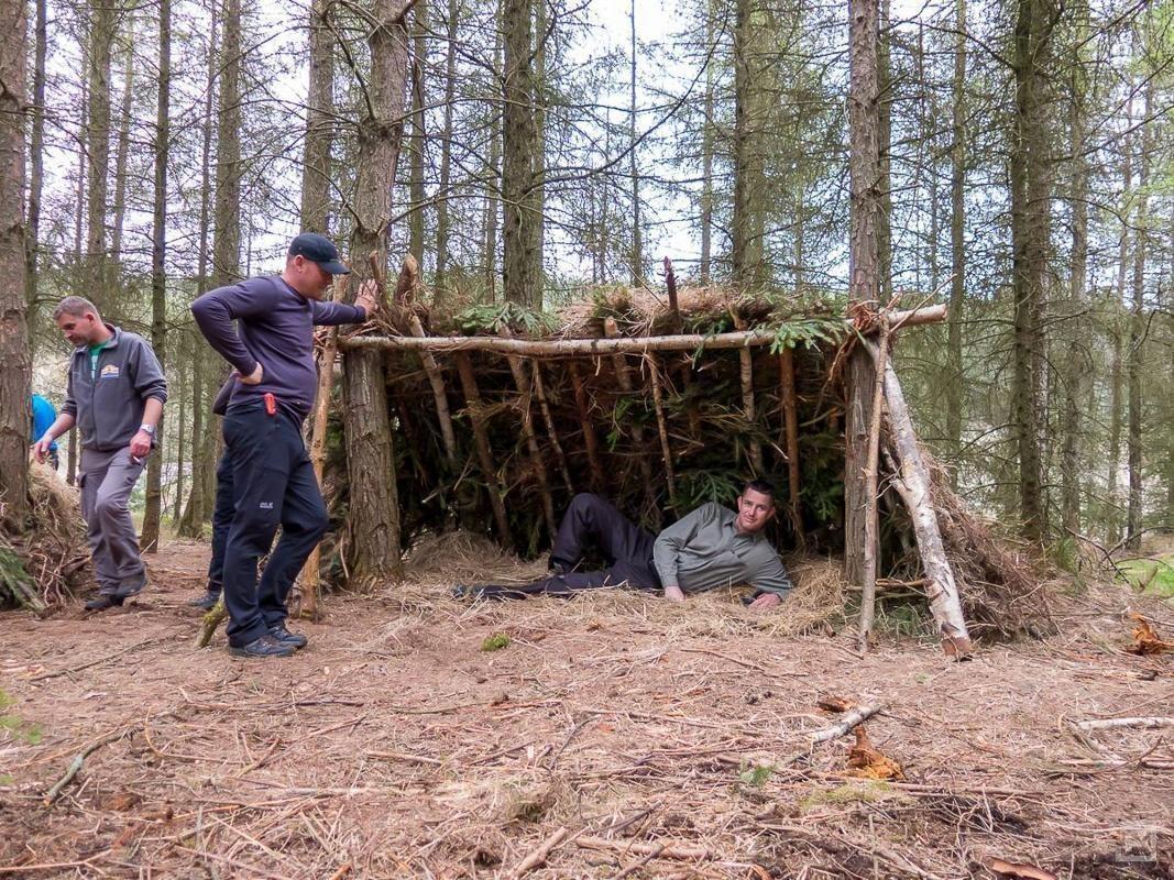 Gruppe arbeitet an einer selbstgebauten Tarp-Notunterkunft im Wald