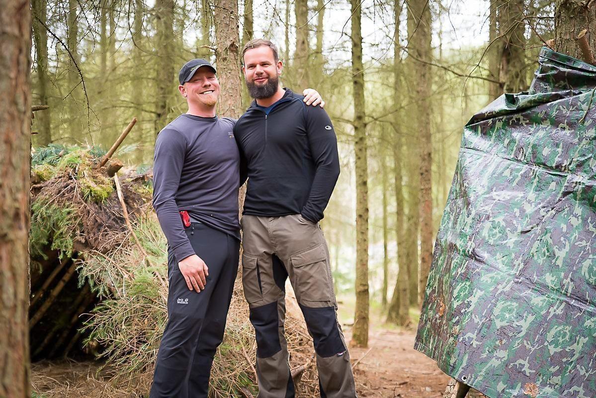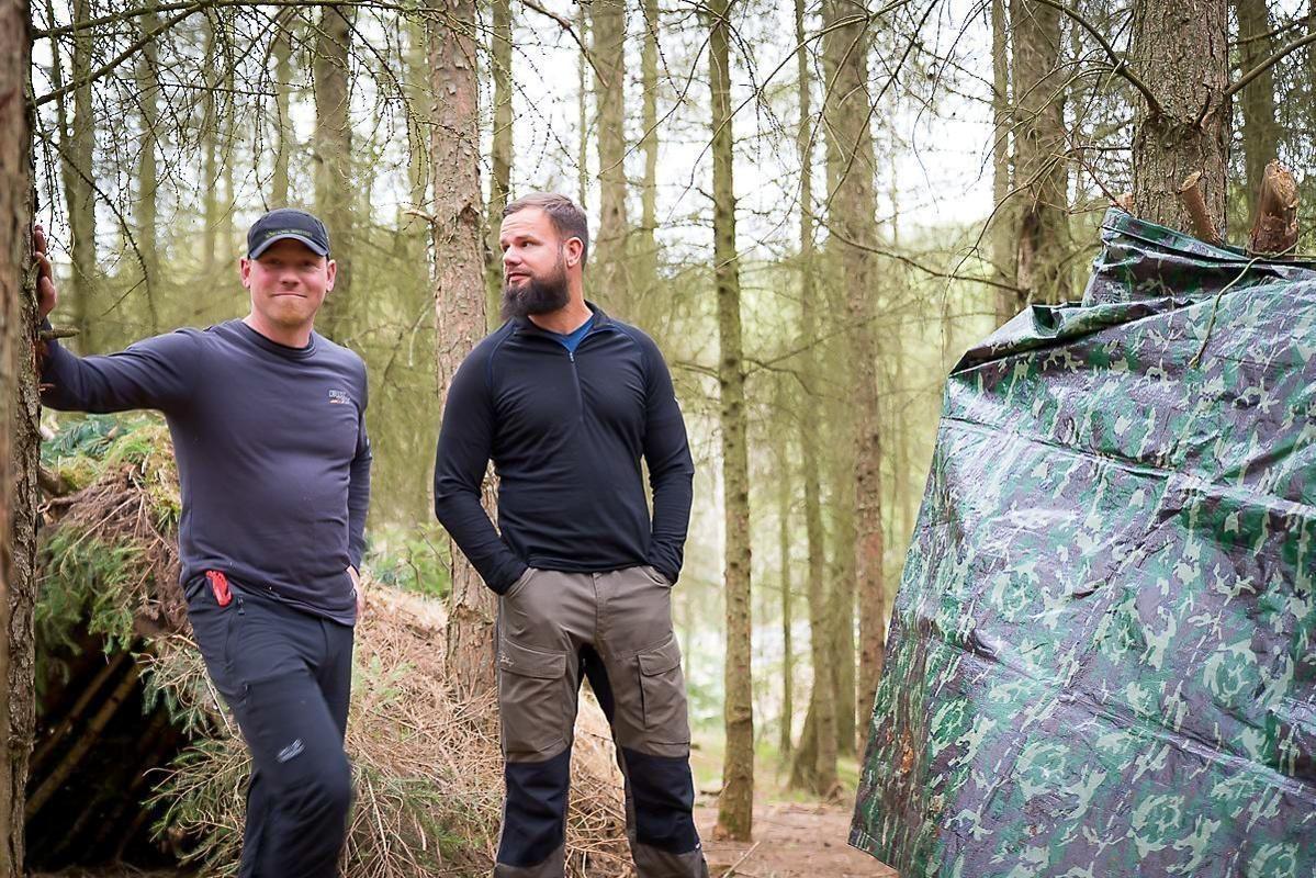 Zwei Personen stehen neben einer Tarp-Notunterkunft im Wald