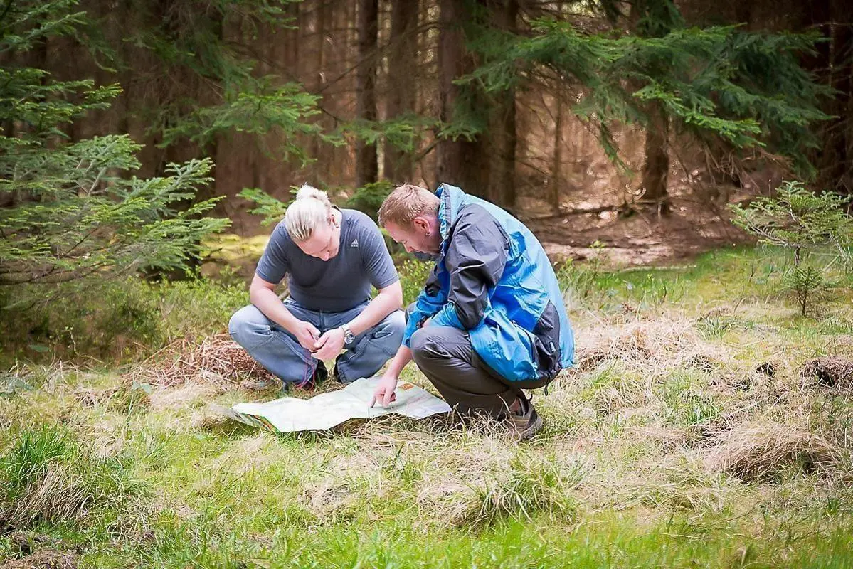 Zwei Personen studieren eine Karte im Wald, eine Kompass in der Hand