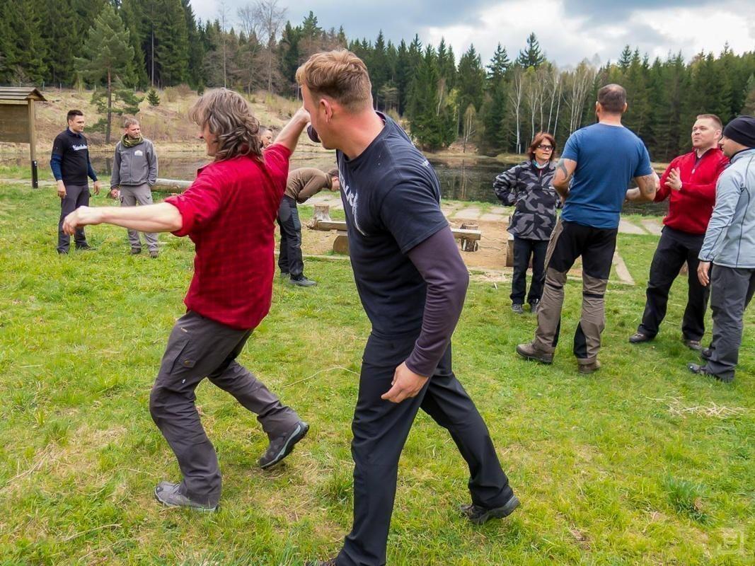 Zwei Personen üben eine körperliche Technik im Freien, während andere Teilnehmer in der Umgebung stehen