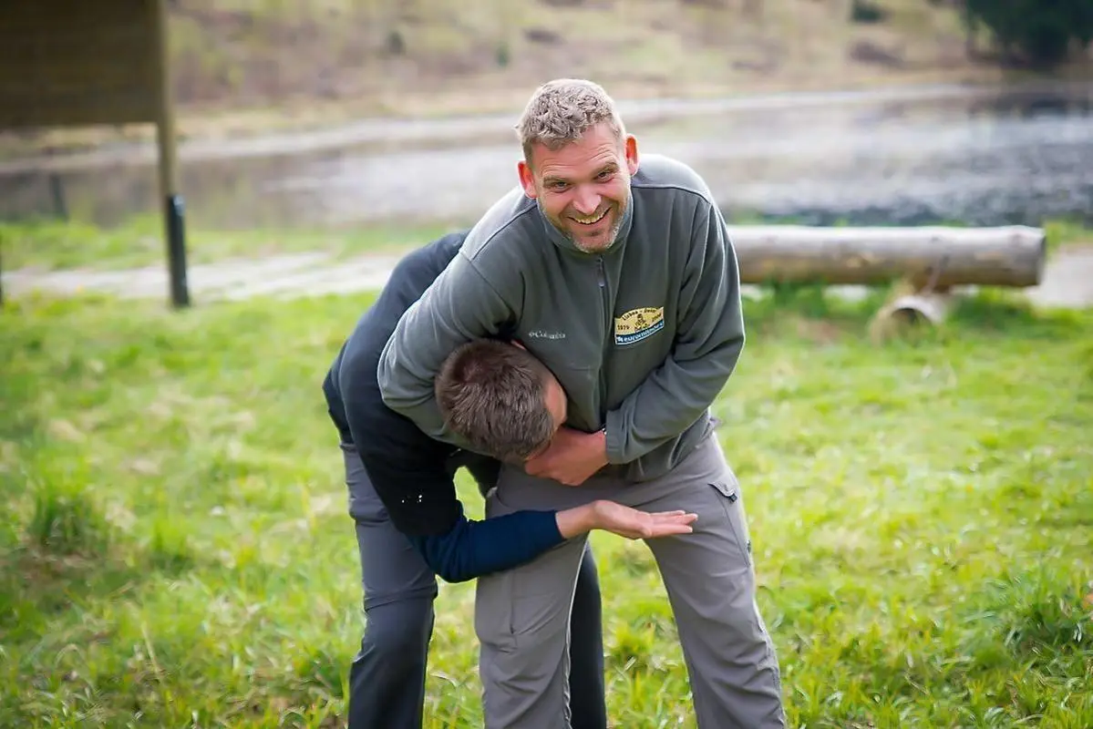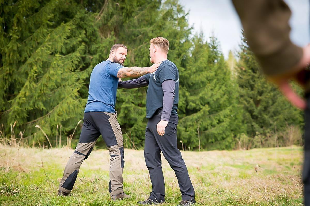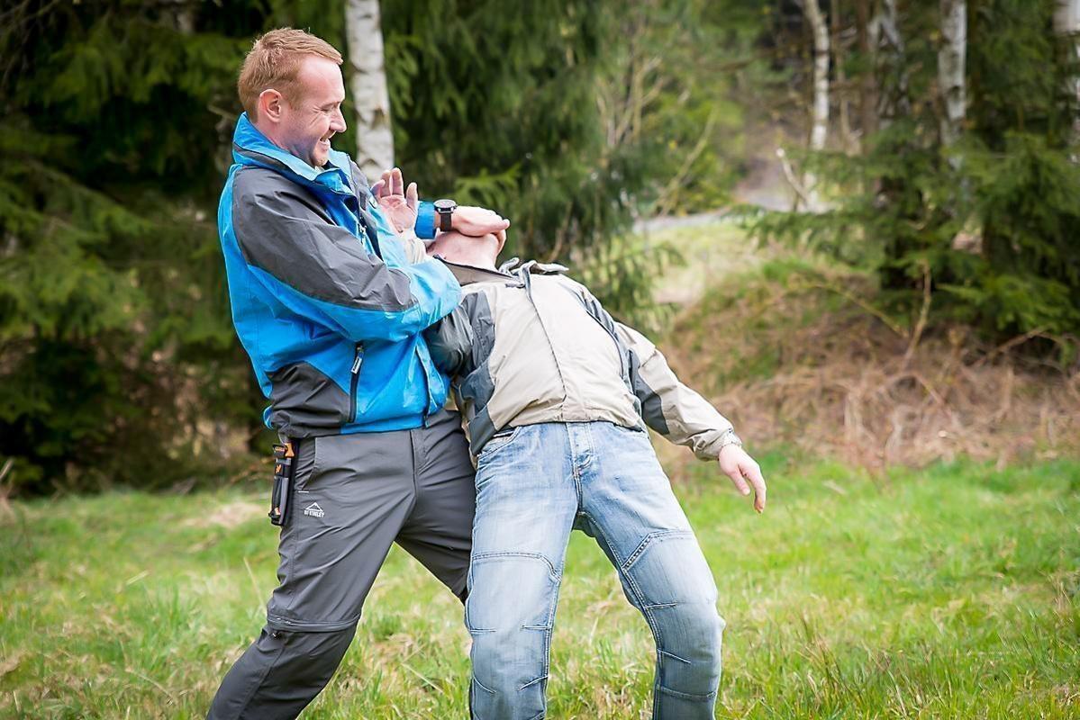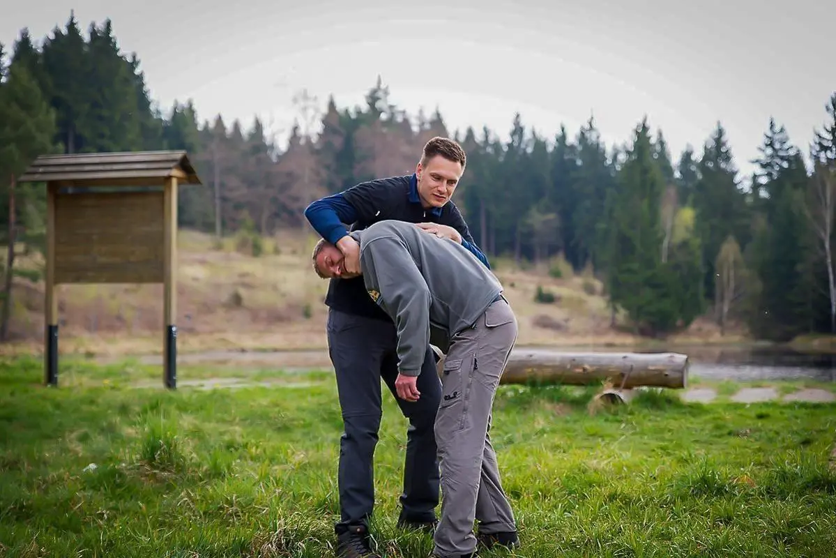 Zwei Personen üben eine Selbstverteidigungstechnik im Freien aus