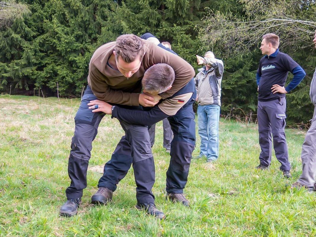 Zwei Personen üben eine Technik zur Kontrolle in einer Wiese, weitere Teilnehmer im Hintergrund