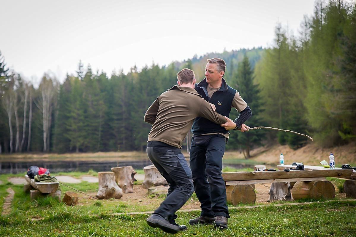 Zwei Personen üben eine Technik mit einem Stock in einer Waldumgebung