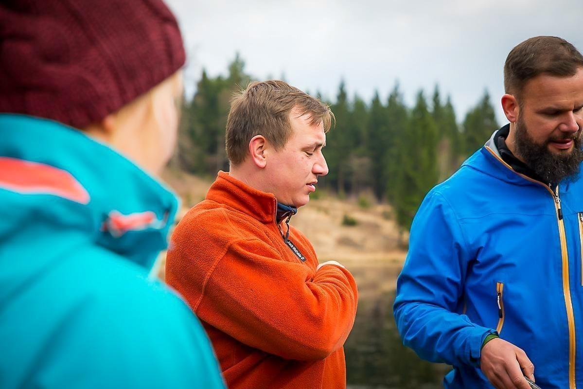 Drei Personen stehen in einer Waldlandschaft und betrachten einen Stock