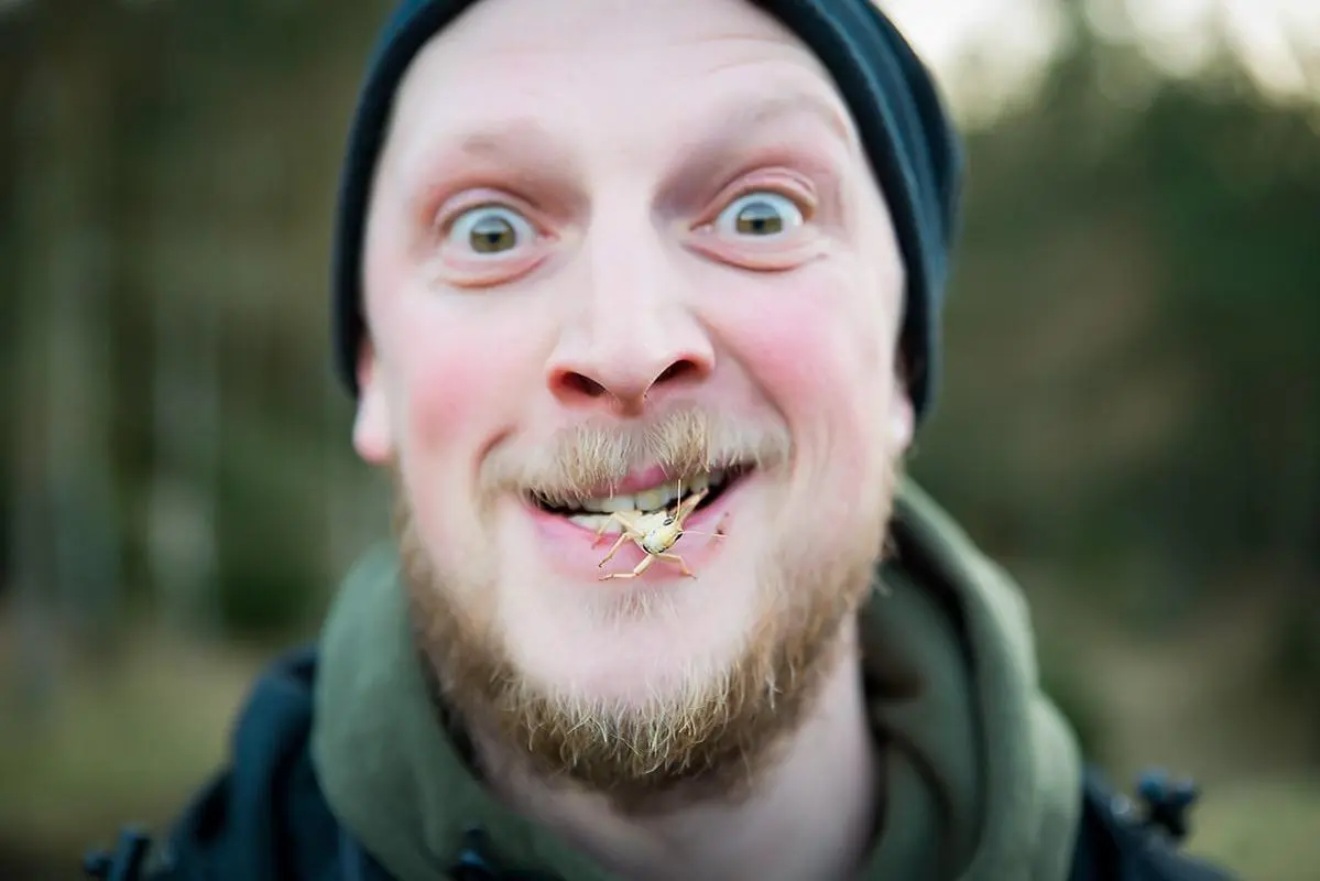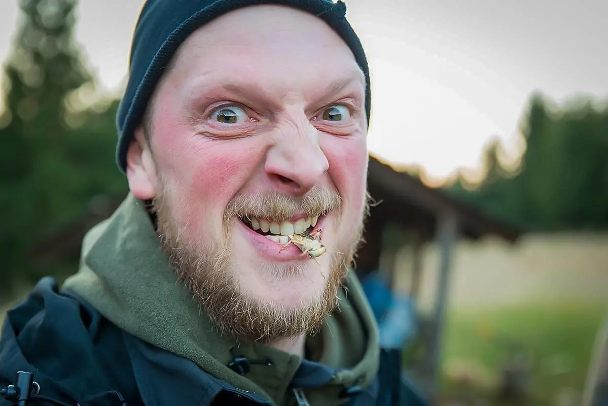 Ein Mann mit Bart lächelt breit und hat ein Insekt im Mund