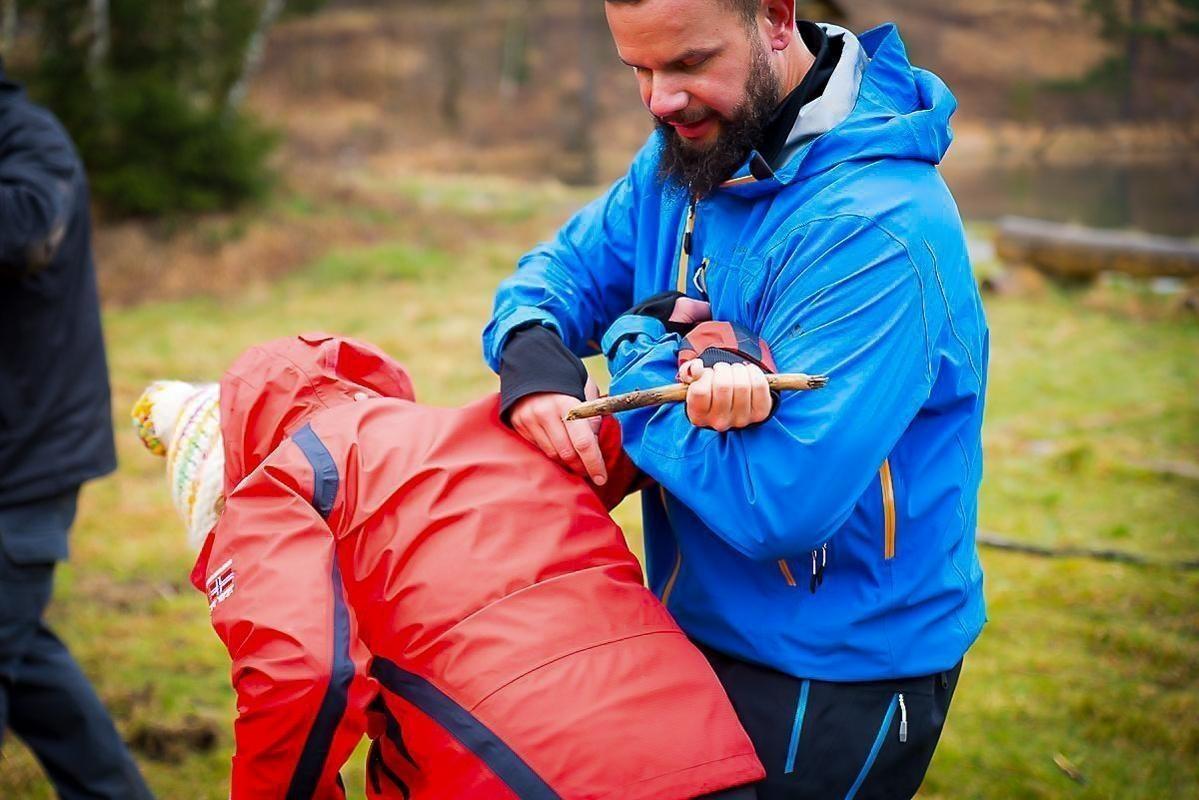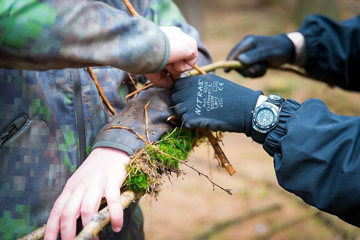 Zwei Personen binden improvisierte Materialien um ein Handgelenk im Wald