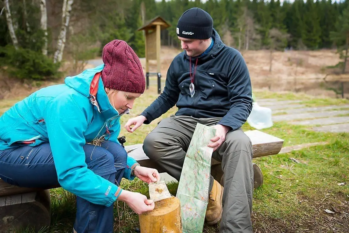 Frau bearbeitet Holzstück, Mann hält Karte und beobachtet