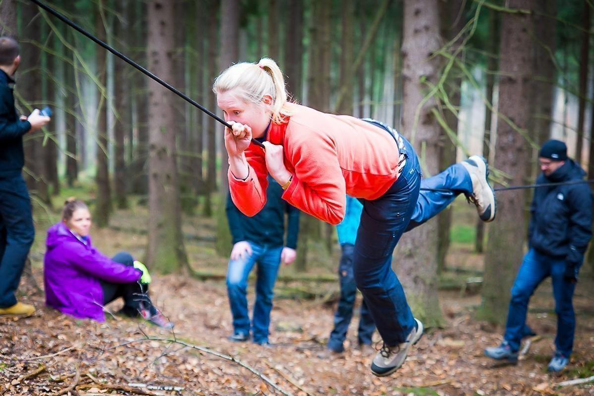 Frau überquert selbstgebaute Seilbrücke im Wald, während andere zuschauen