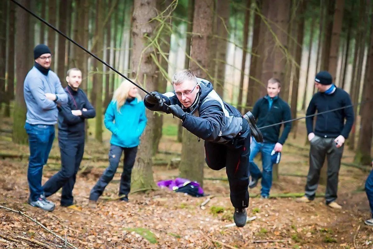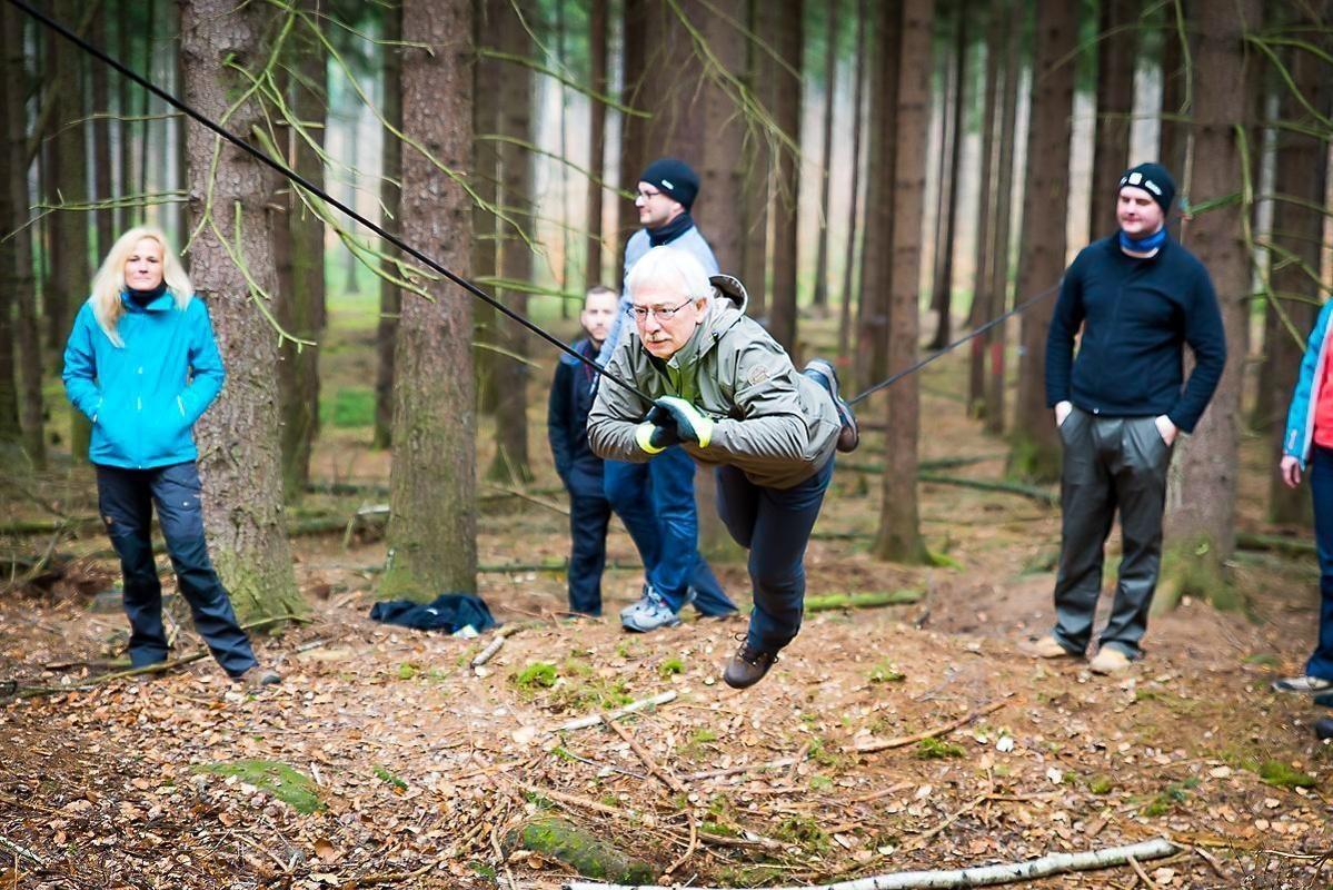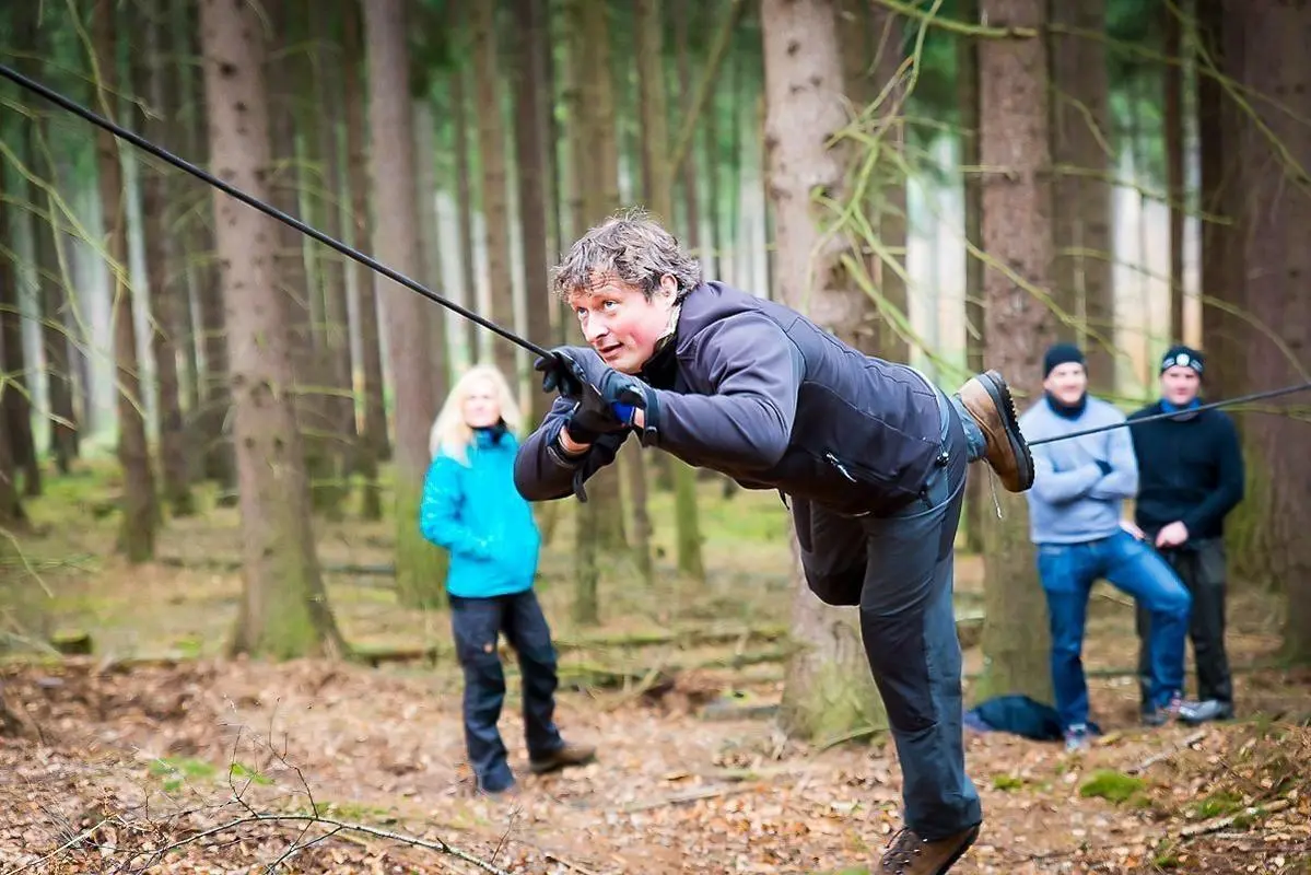 Teilnehmer ziehen an einem Seil während einer Seilquerung im Wald