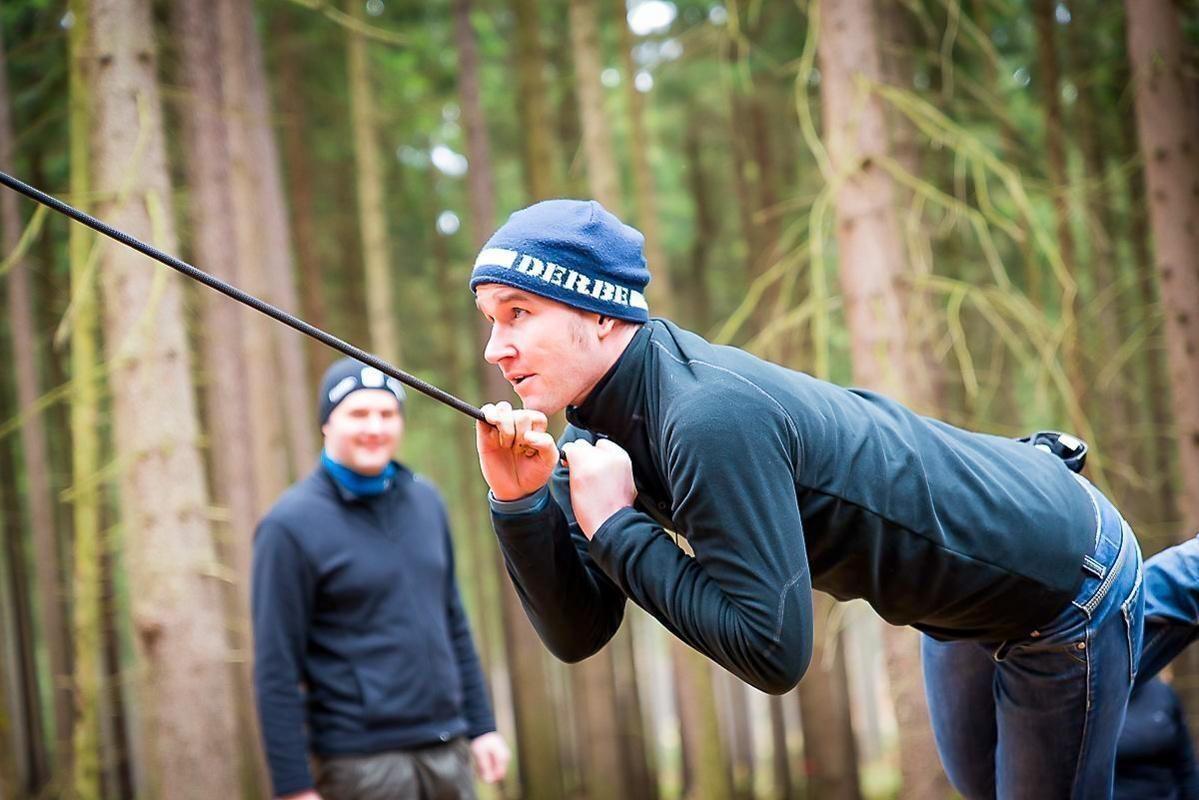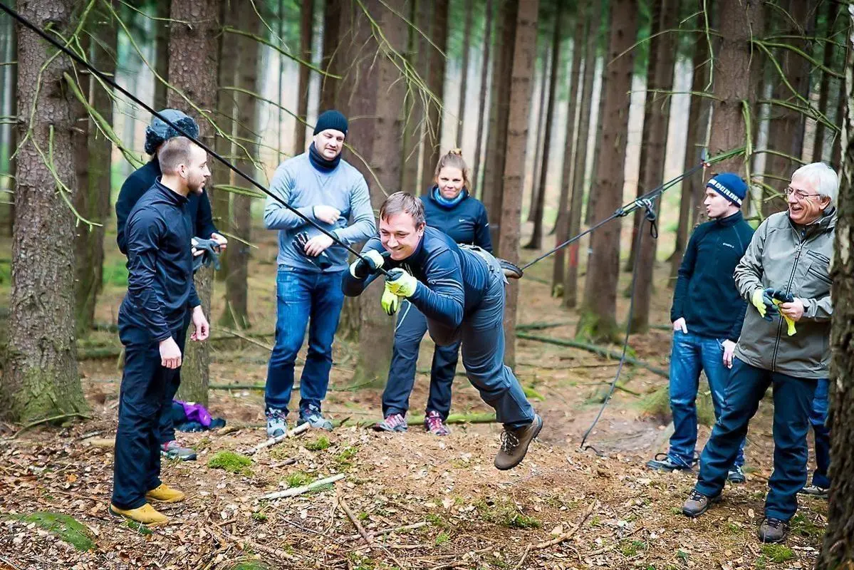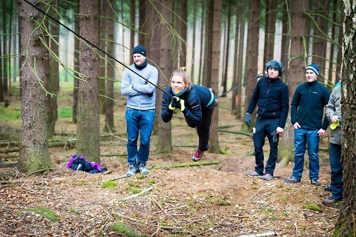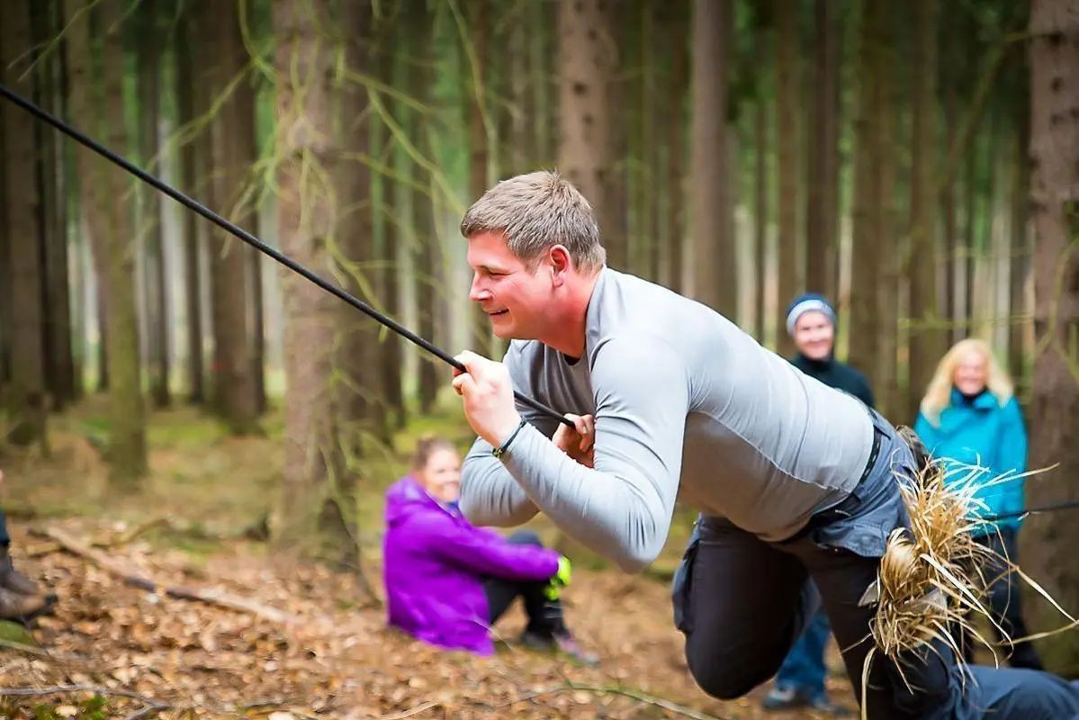 Teilnehmer ziehen an einem Seil während einer Seilquerung im Wald