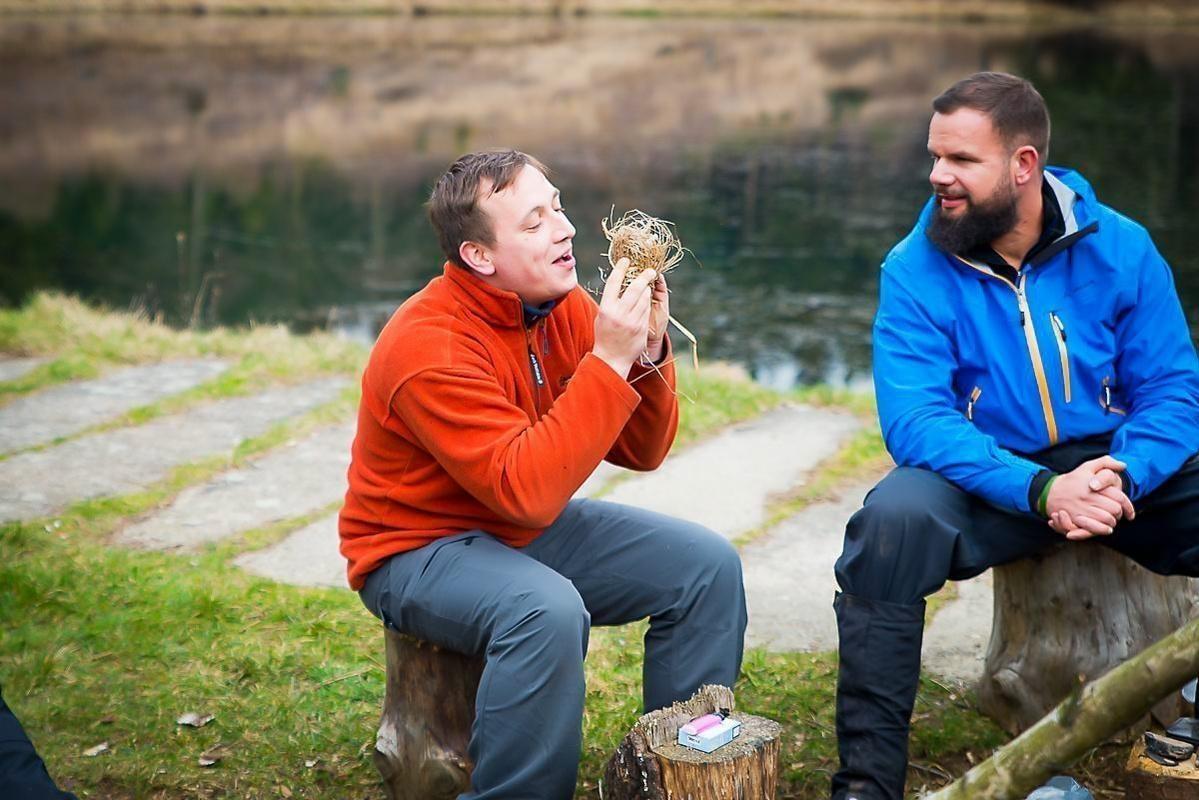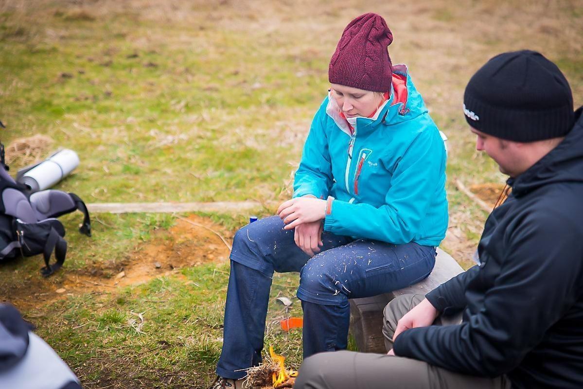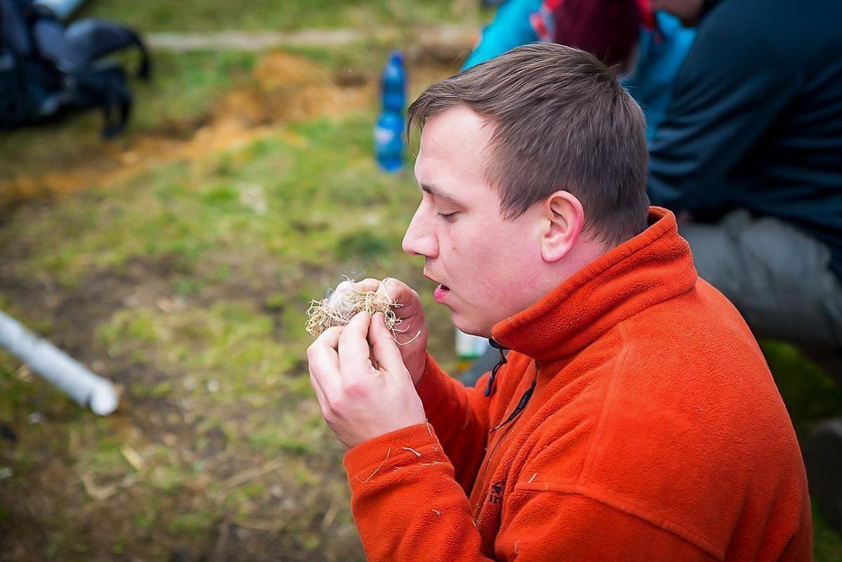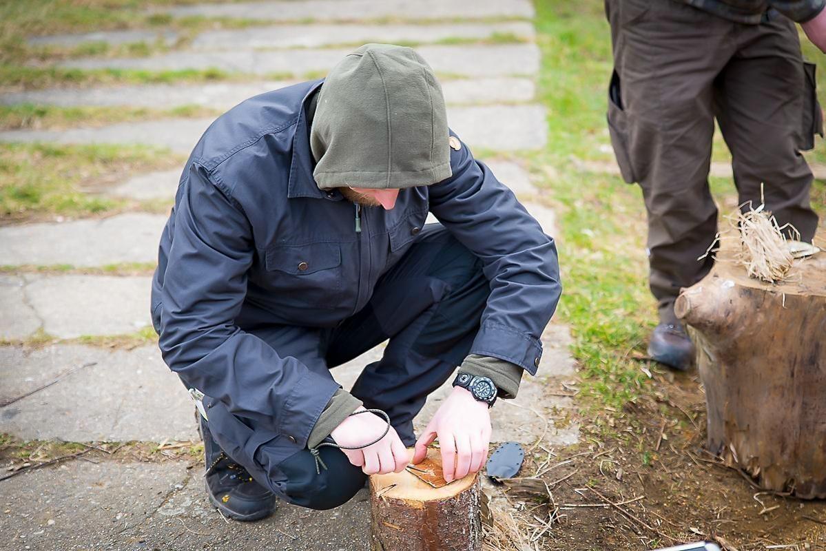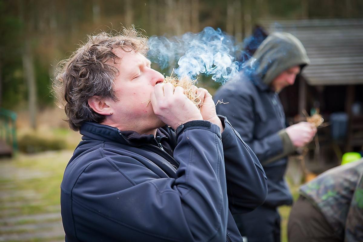 Zunder wird auf einem Baumstumpf vorbereitet, während Teilnehmer um ihn herum sitzen